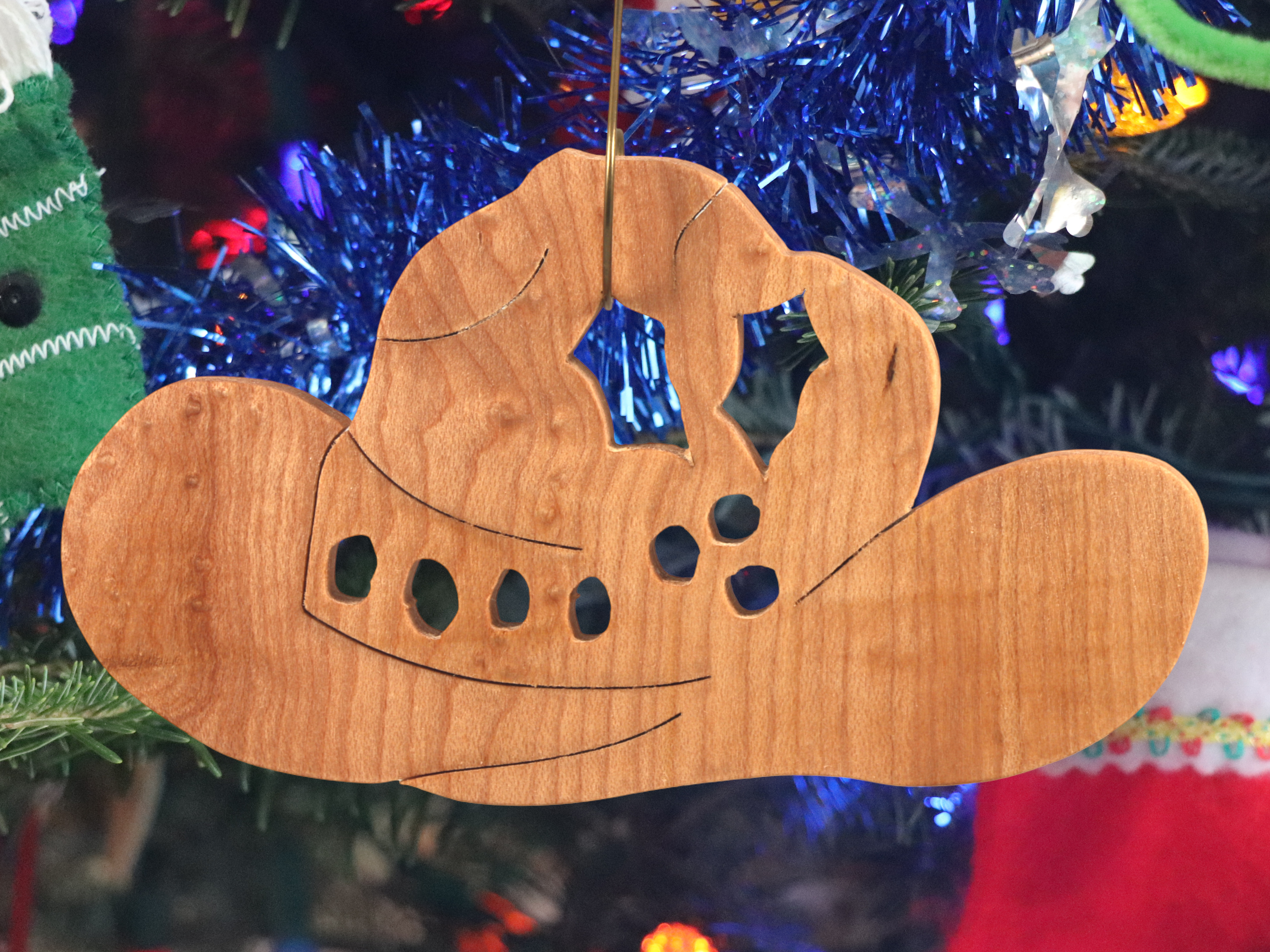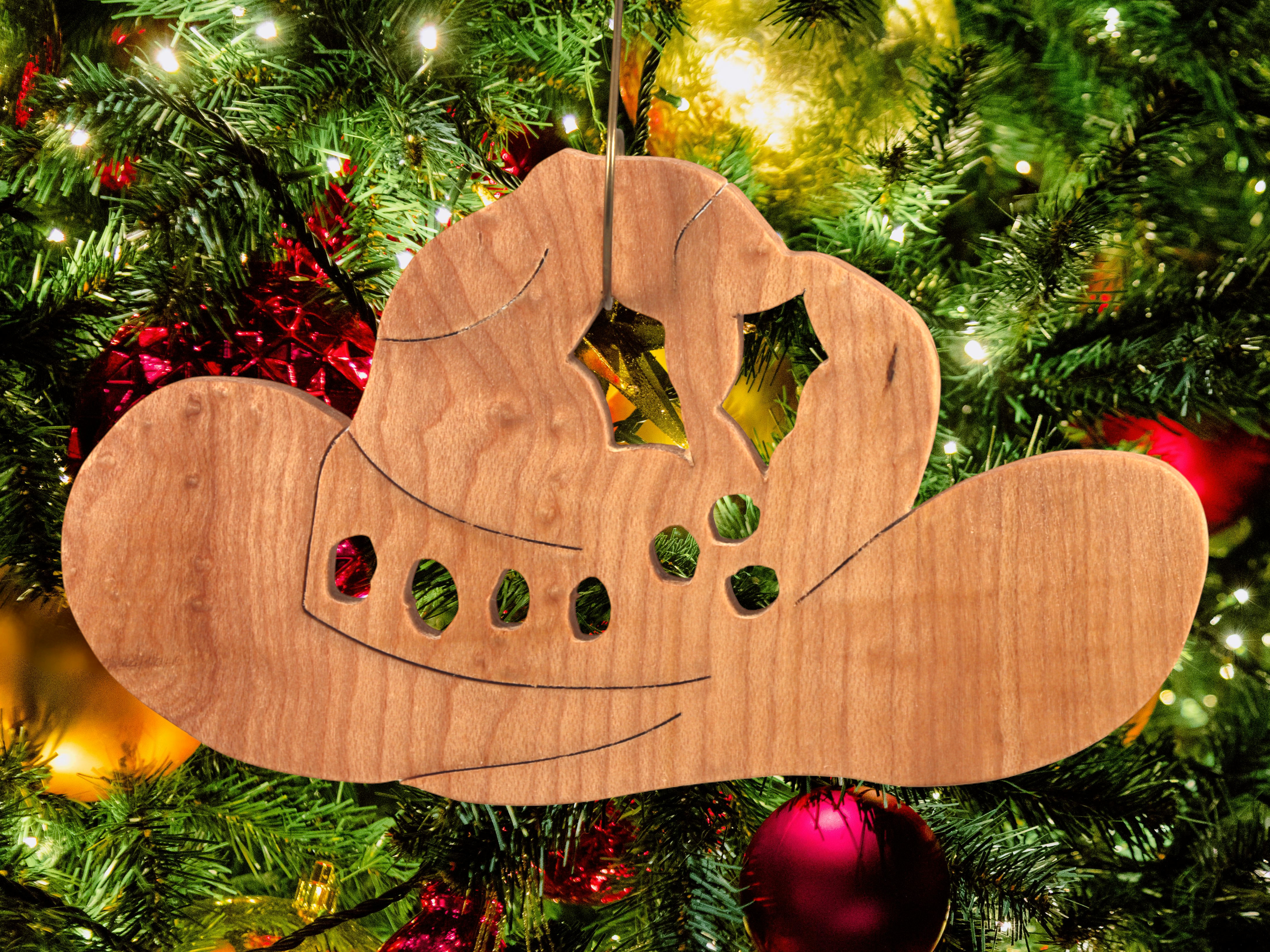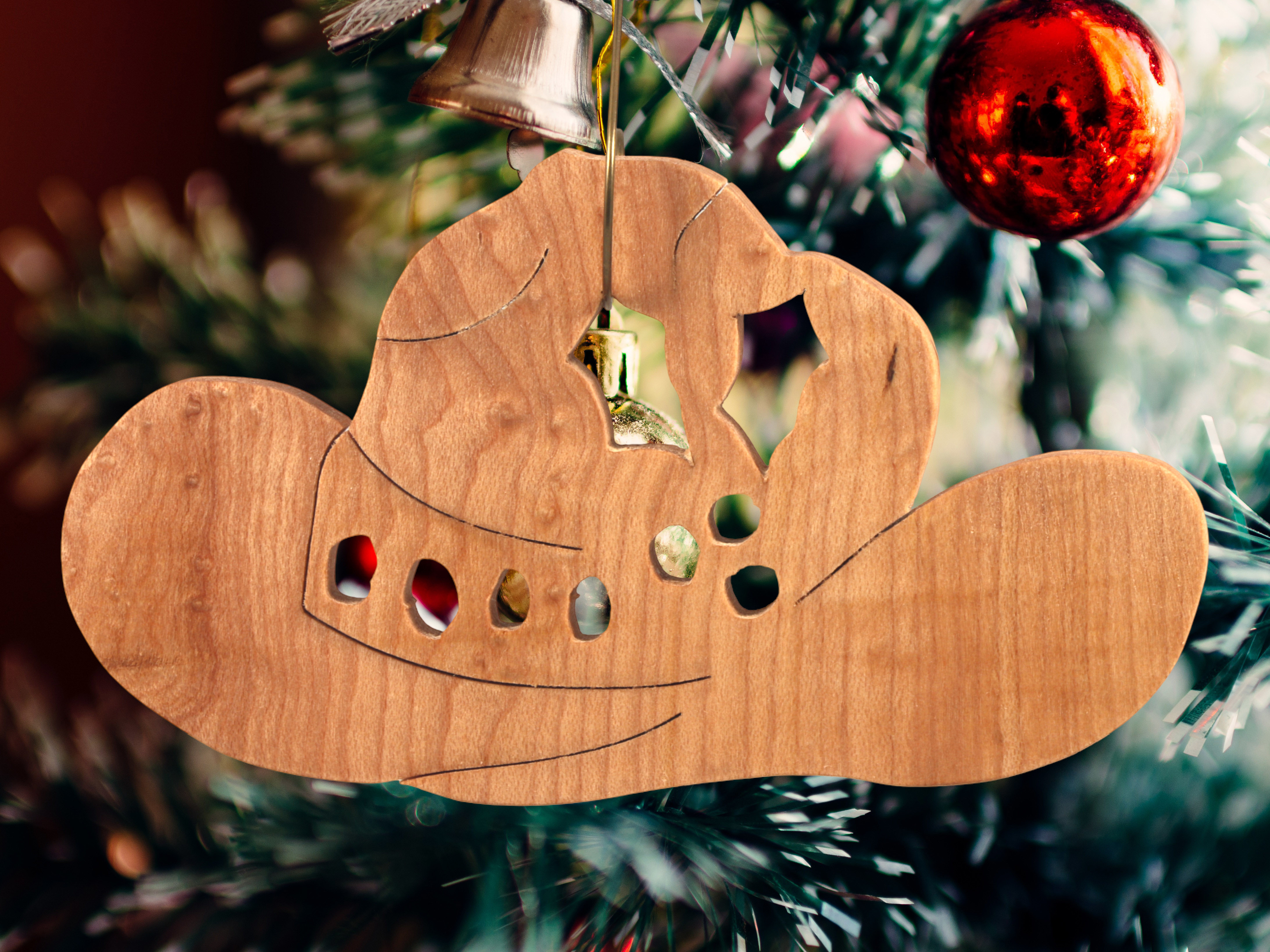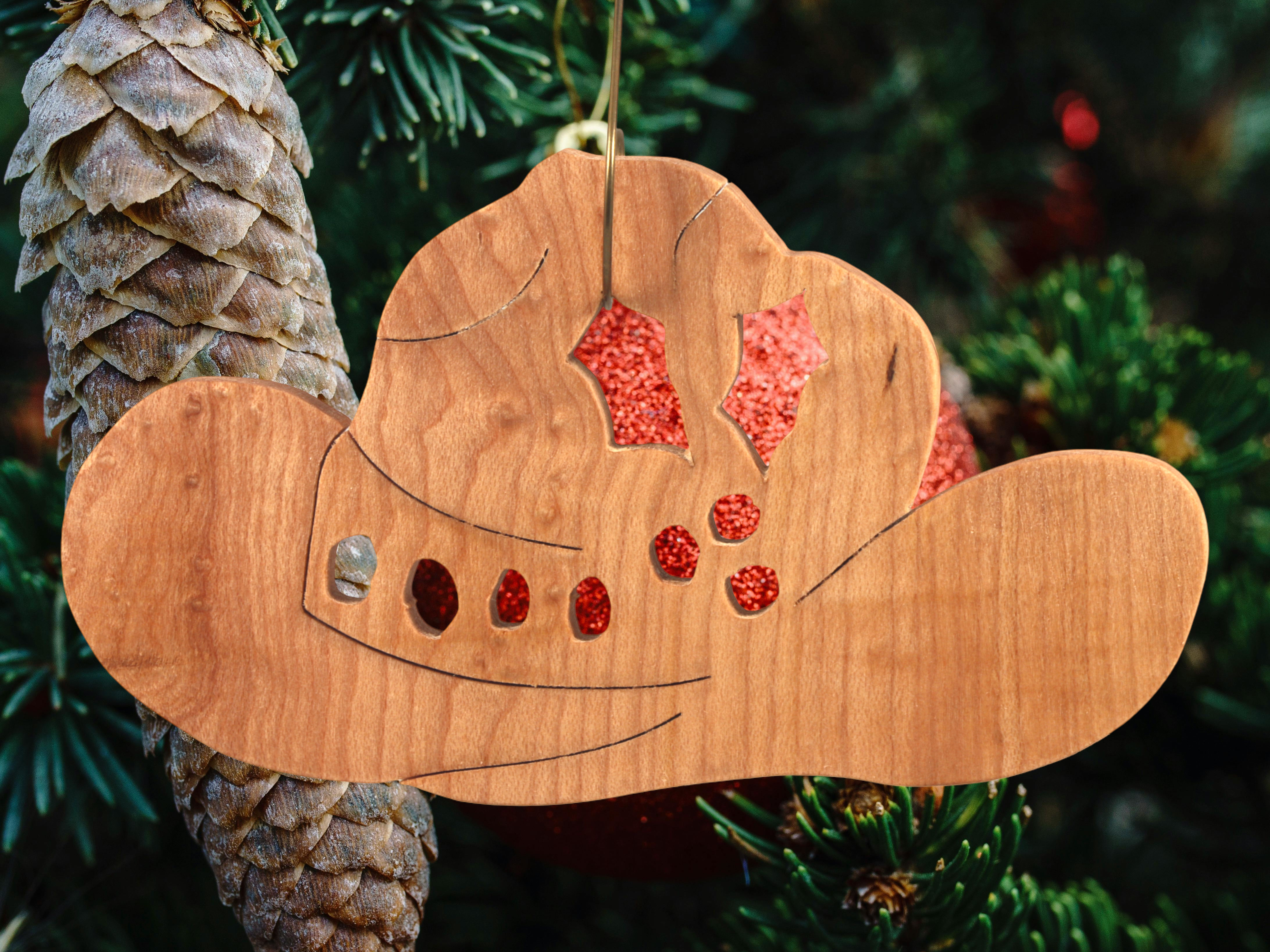 Add a rustic Western flair to your holiday decor with this charming handmade wooden Christmas tree ornament! Crafted from premium cherry wood, this piece is hand-cut into the shape of a classic cowboy hat, complete with an intricately detailed sprig of holly tucked into the hat band. The holly design features stylized leaf cutouts on the crown and berry accents, creating a whimsical fusion of cowboy style and festive cheer.