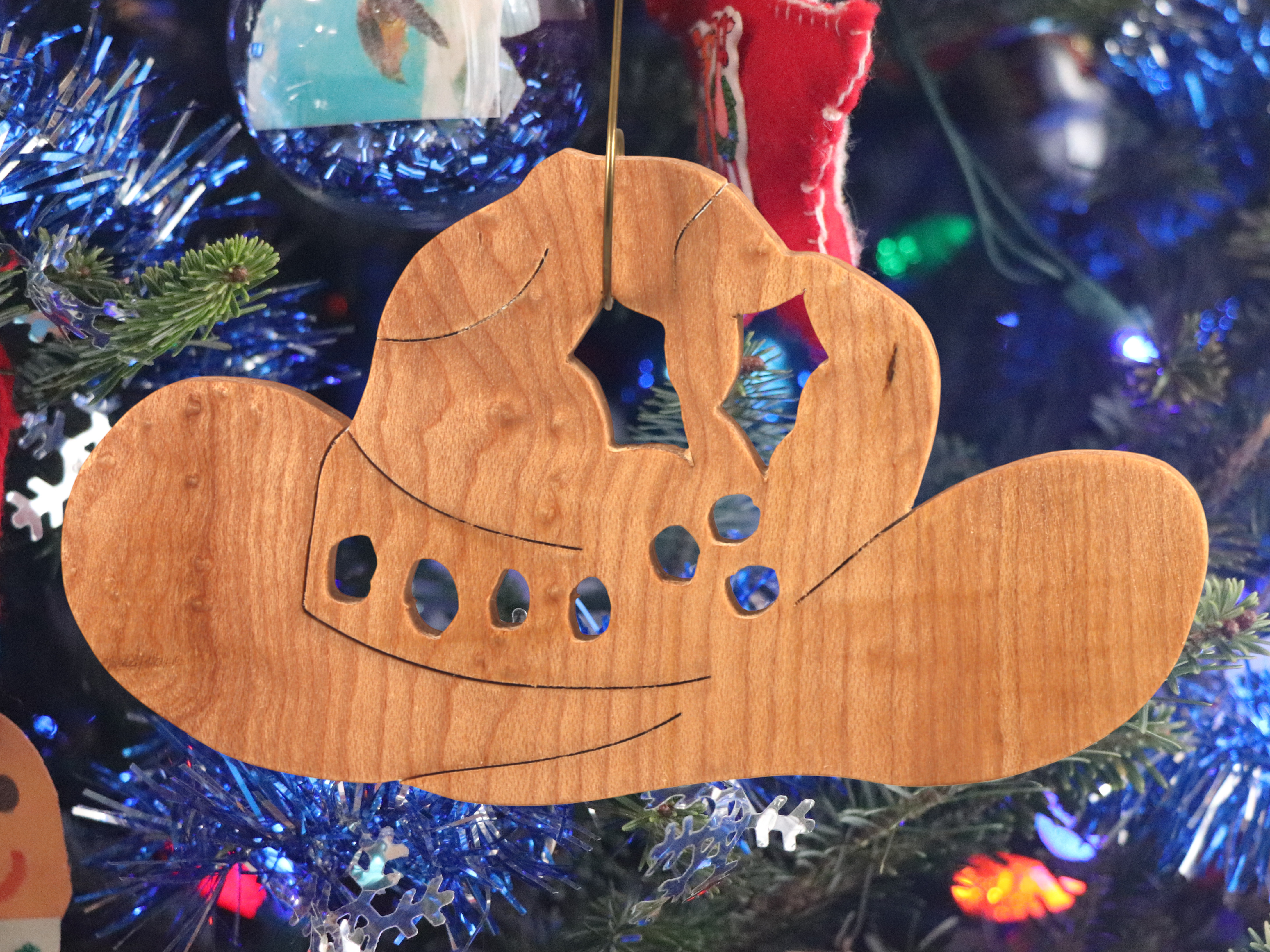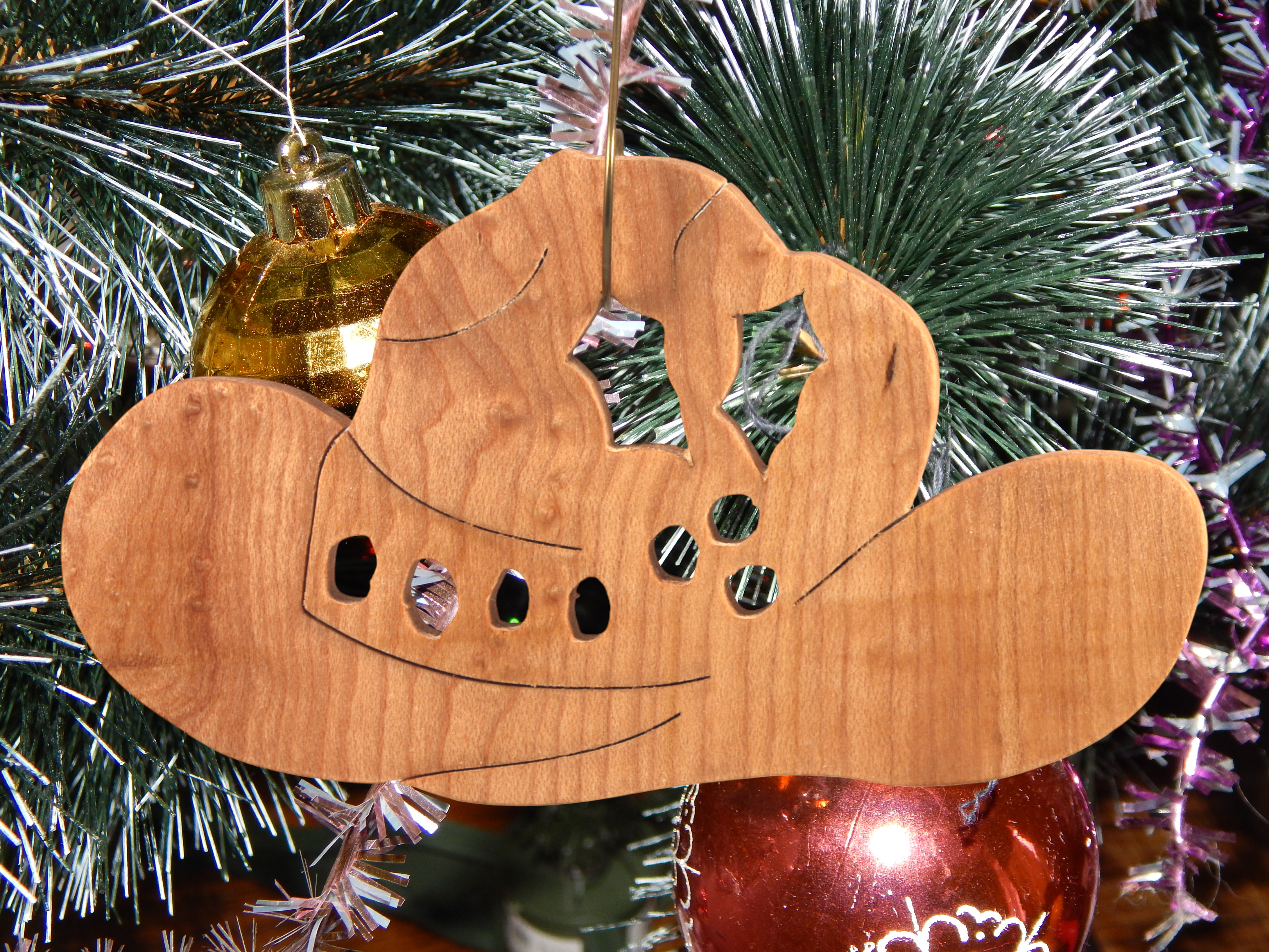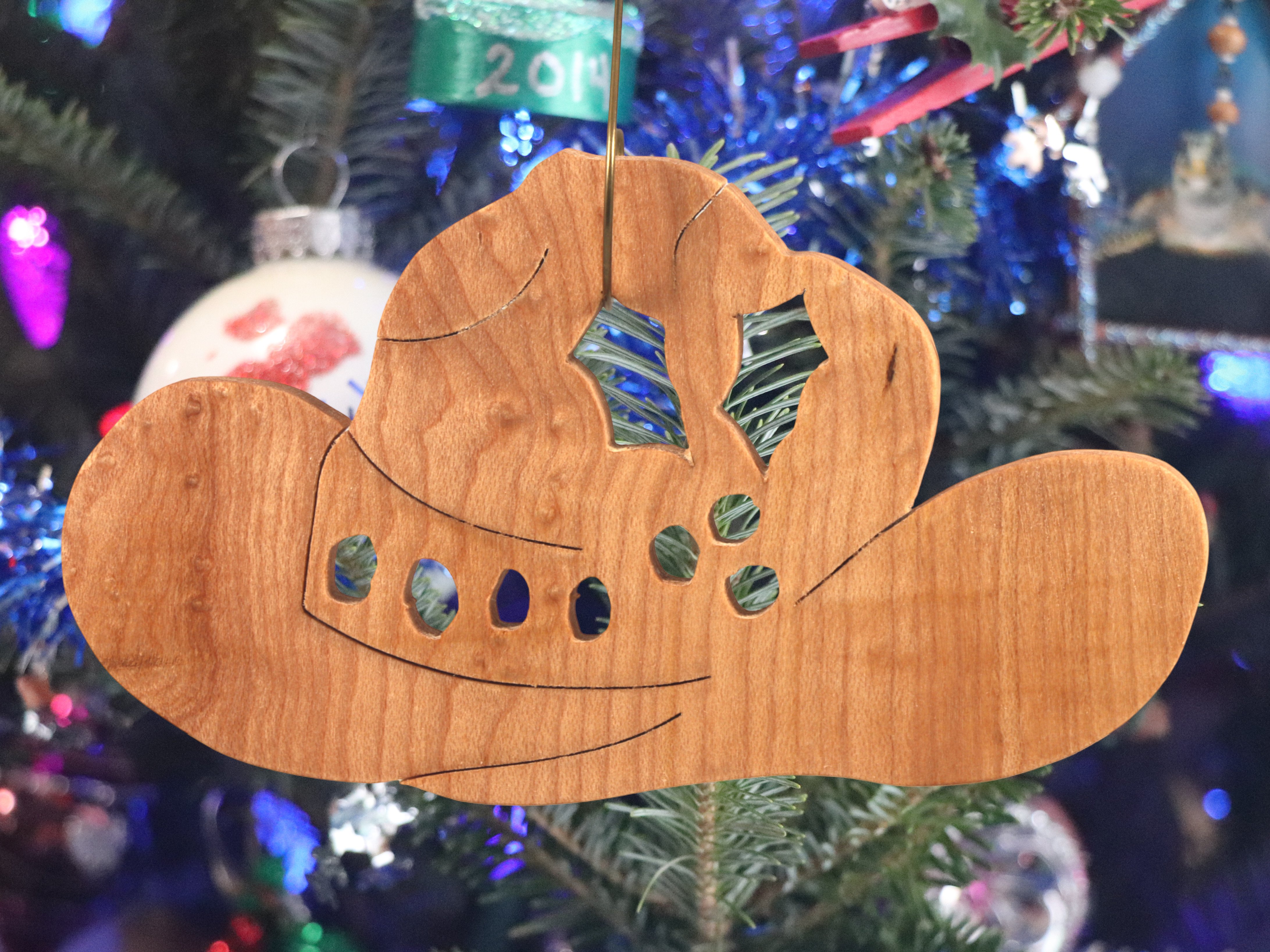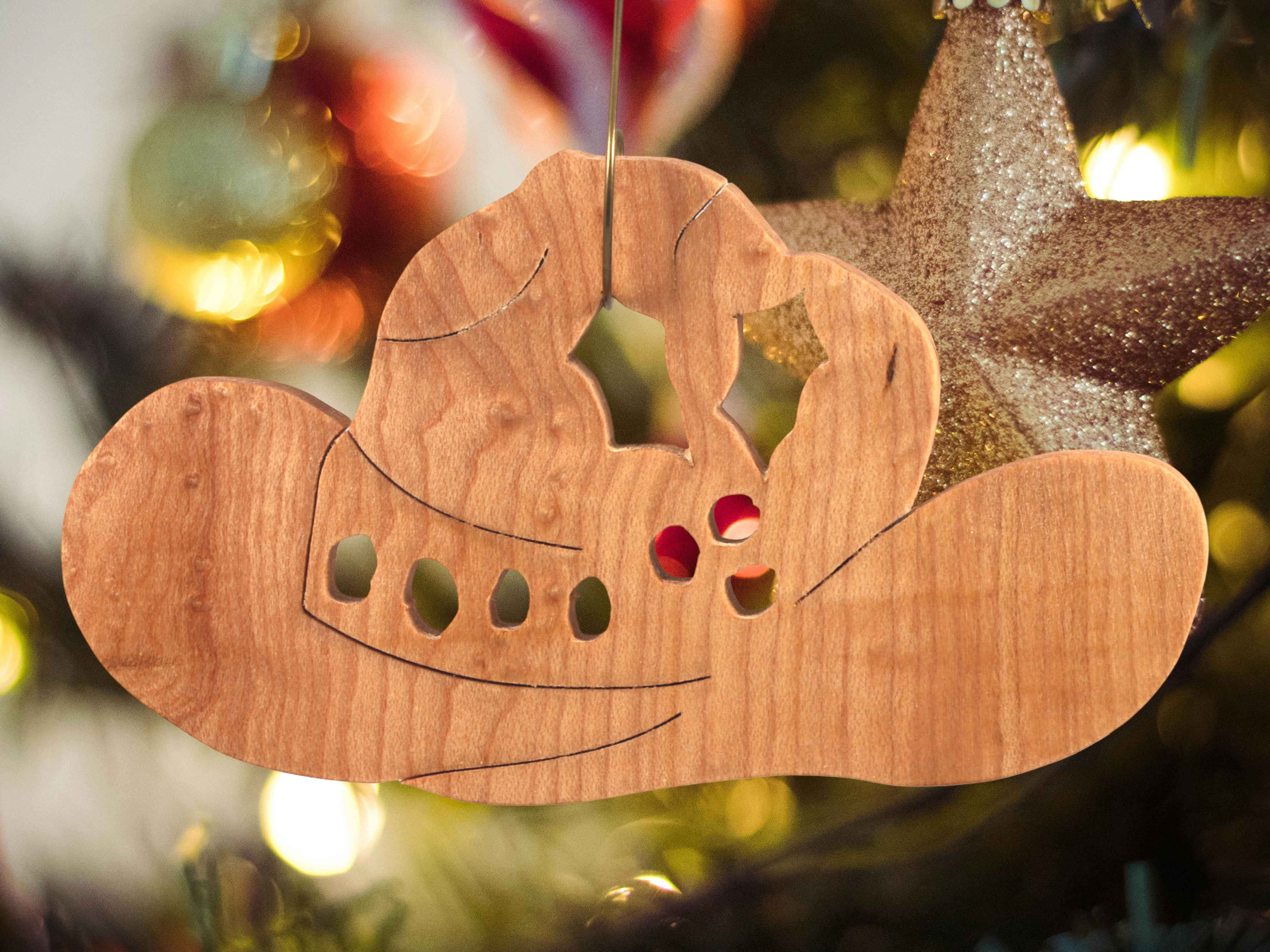 Add a rustic Western flair to your holiday decor with this charming handmade wooden Christmas tree ornament! Crafted from premium cherry wood, this piece is hand-cut into the shape of a classic cowboy hat, complete with an intricately detailed sprig of holly tucked into the hat band. The holly design features stylized leaf cutouts on the crown and berry accents, creating a whimsical fusion of cowboy style and festive cheer.