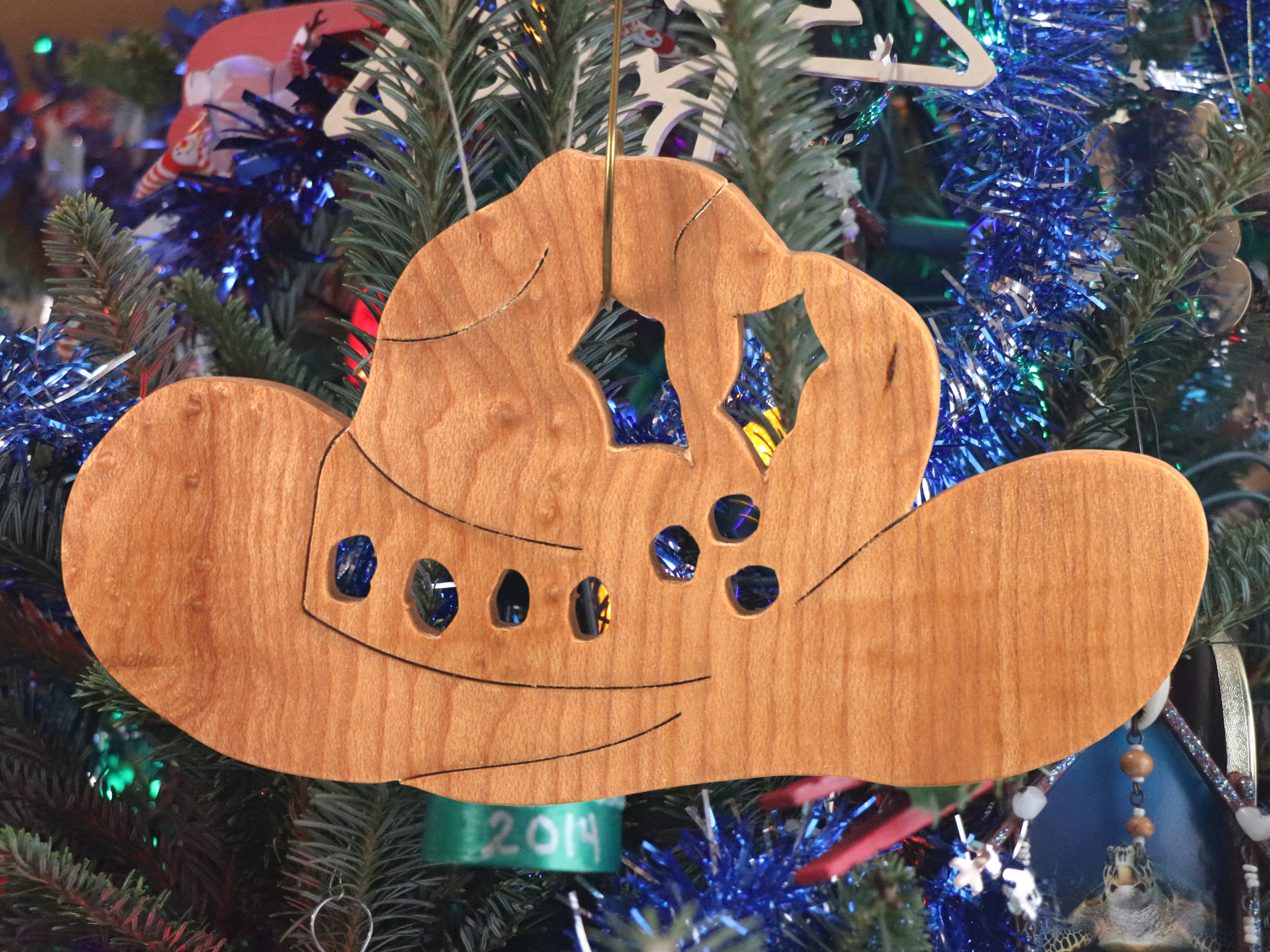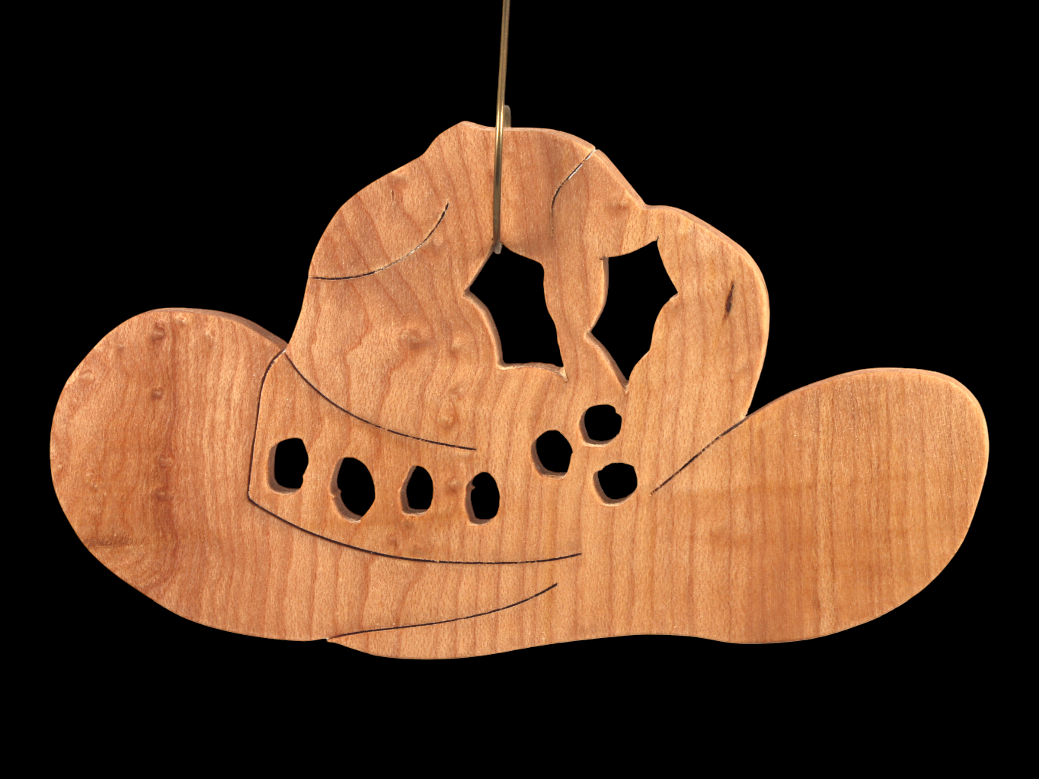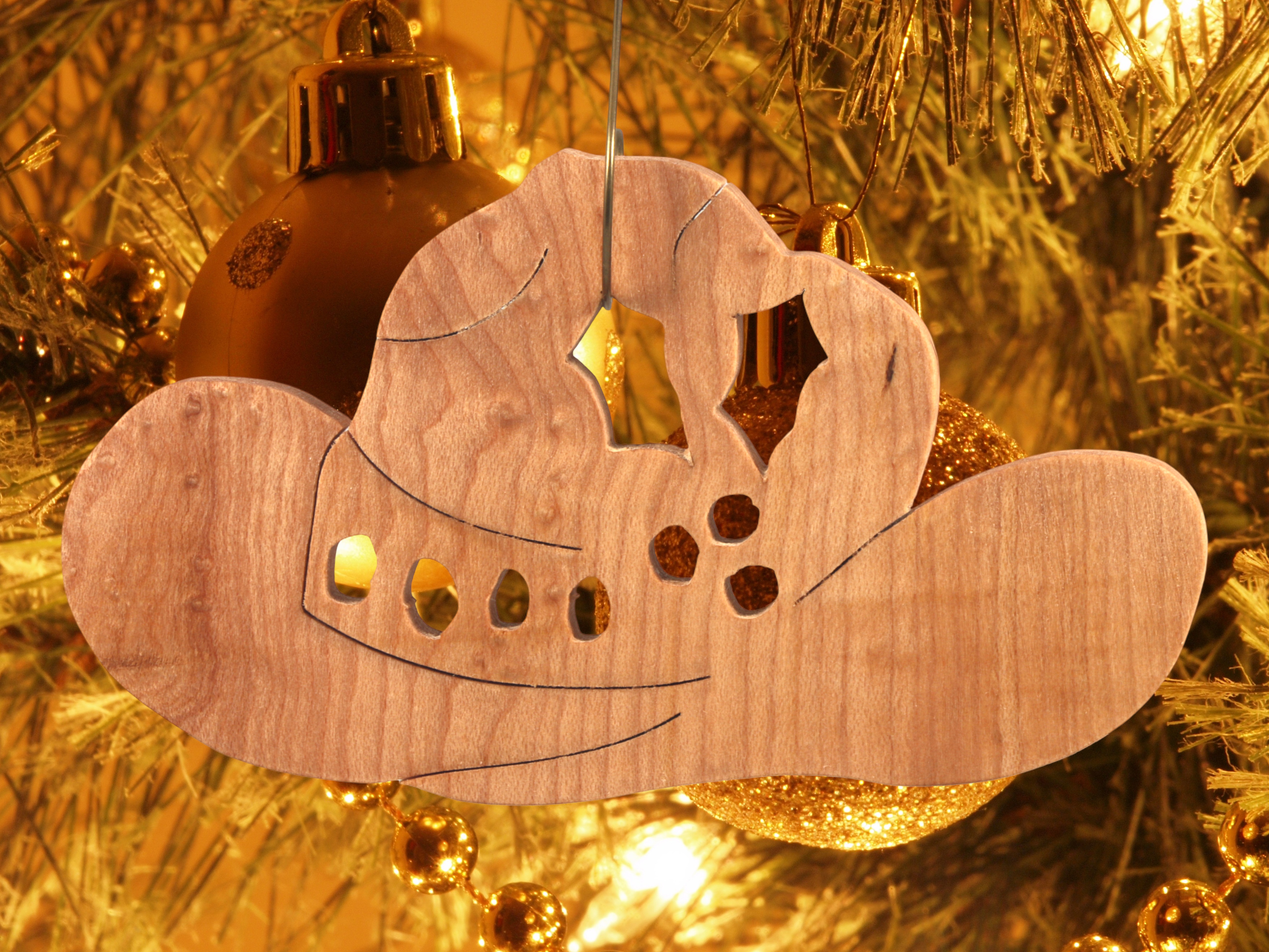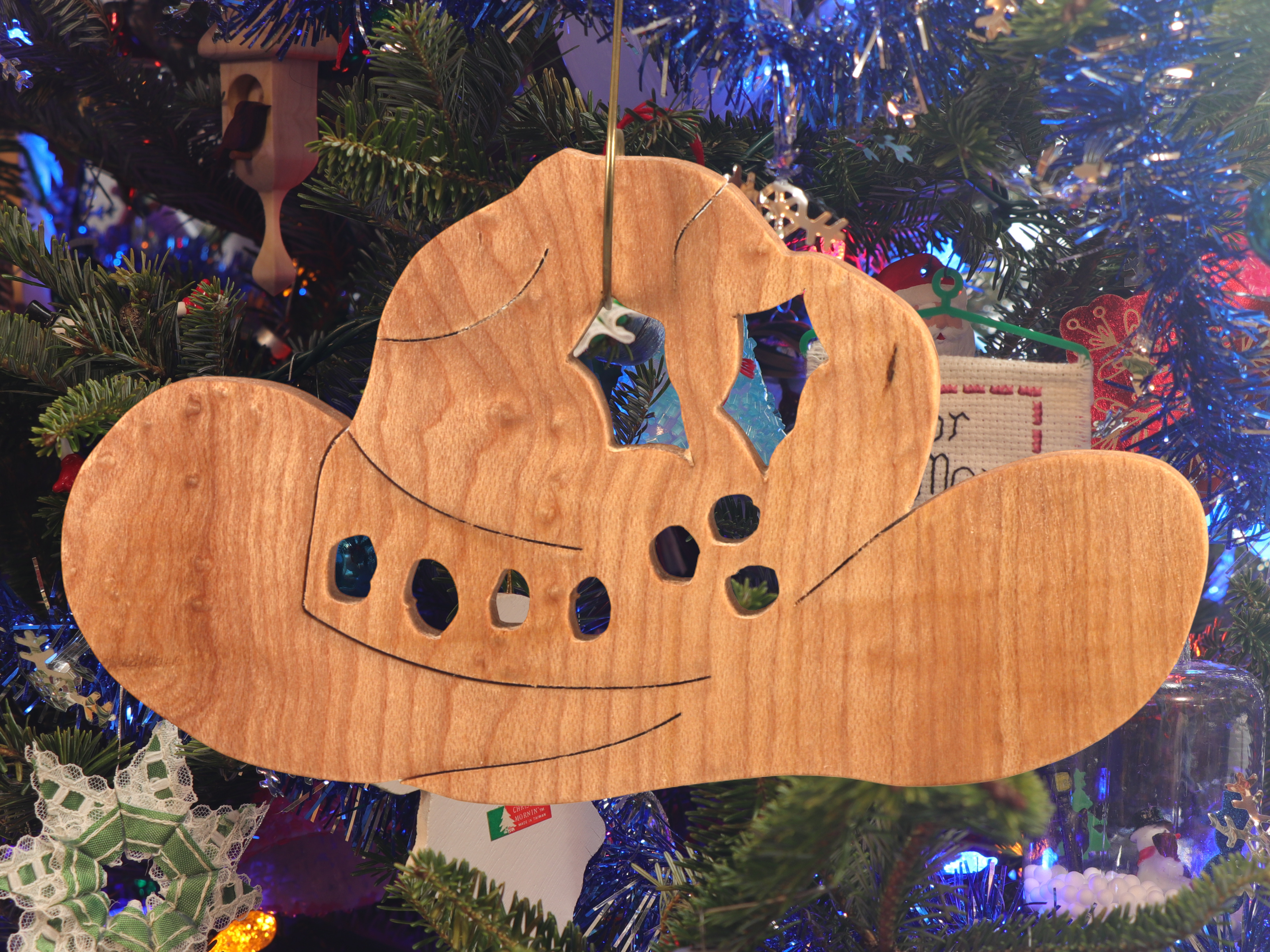 Add a rustic Western flair to your holiday decor with this charming handmade wooden Christmas tree ornament! Crafted from premium cherry wood, this piece is hand-cut into the shape of a classic cowboy hat, complete with an intricately detailed sprig of holly tucked into the hat band. The holly design features stylized leaf cutouts on the crown and berry accents, creating a whimsical fusion of cowboy style and festive cheer.