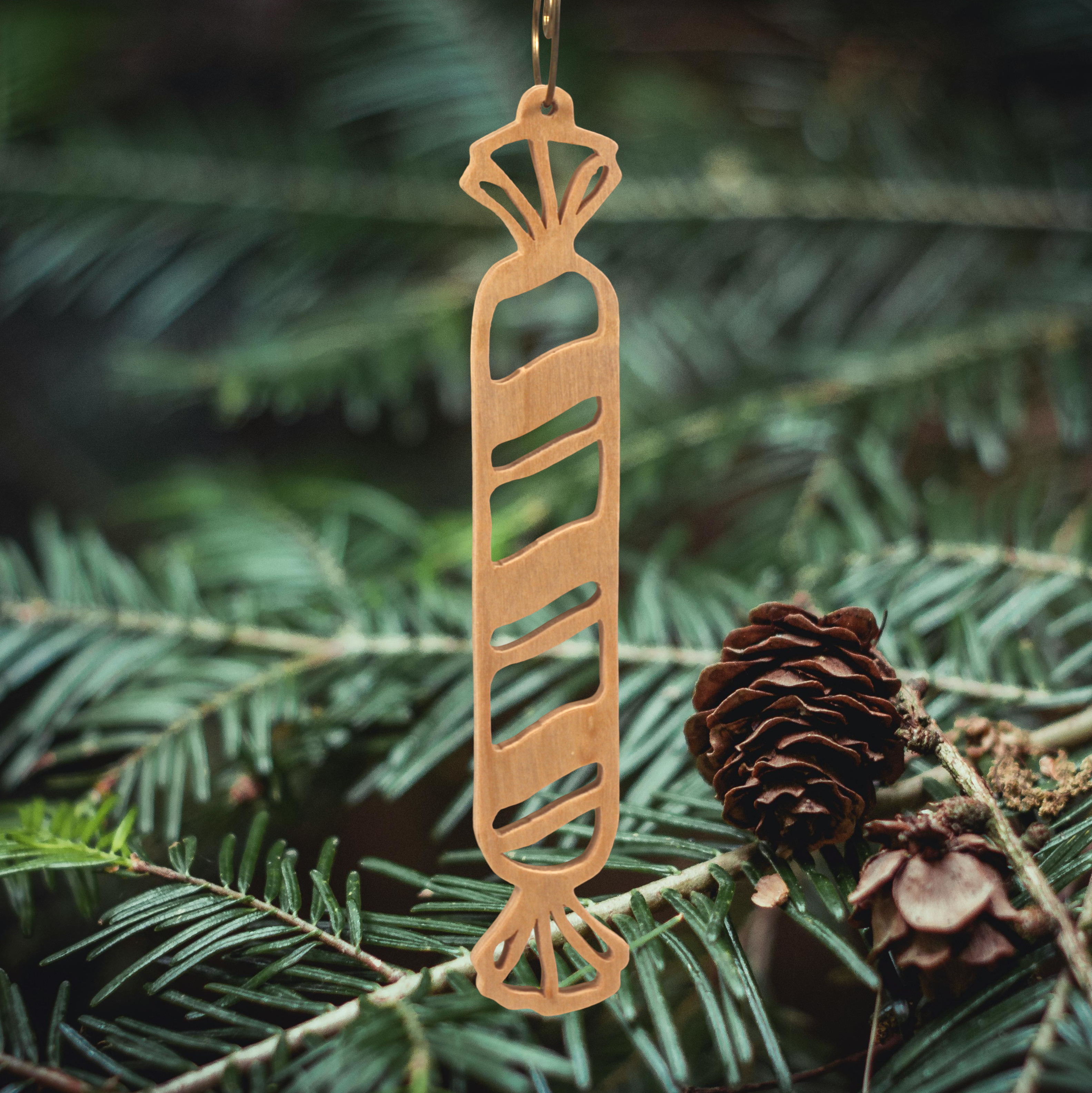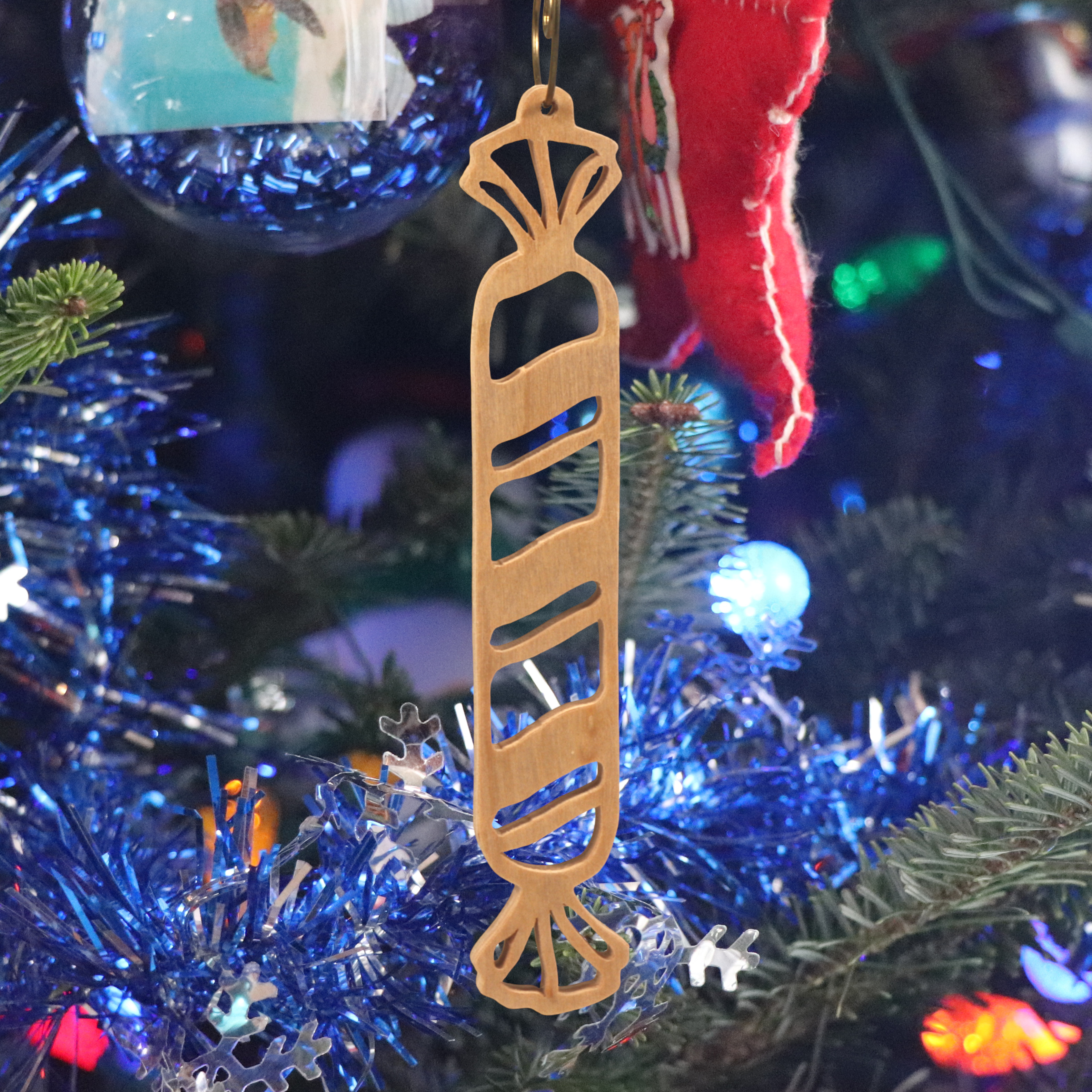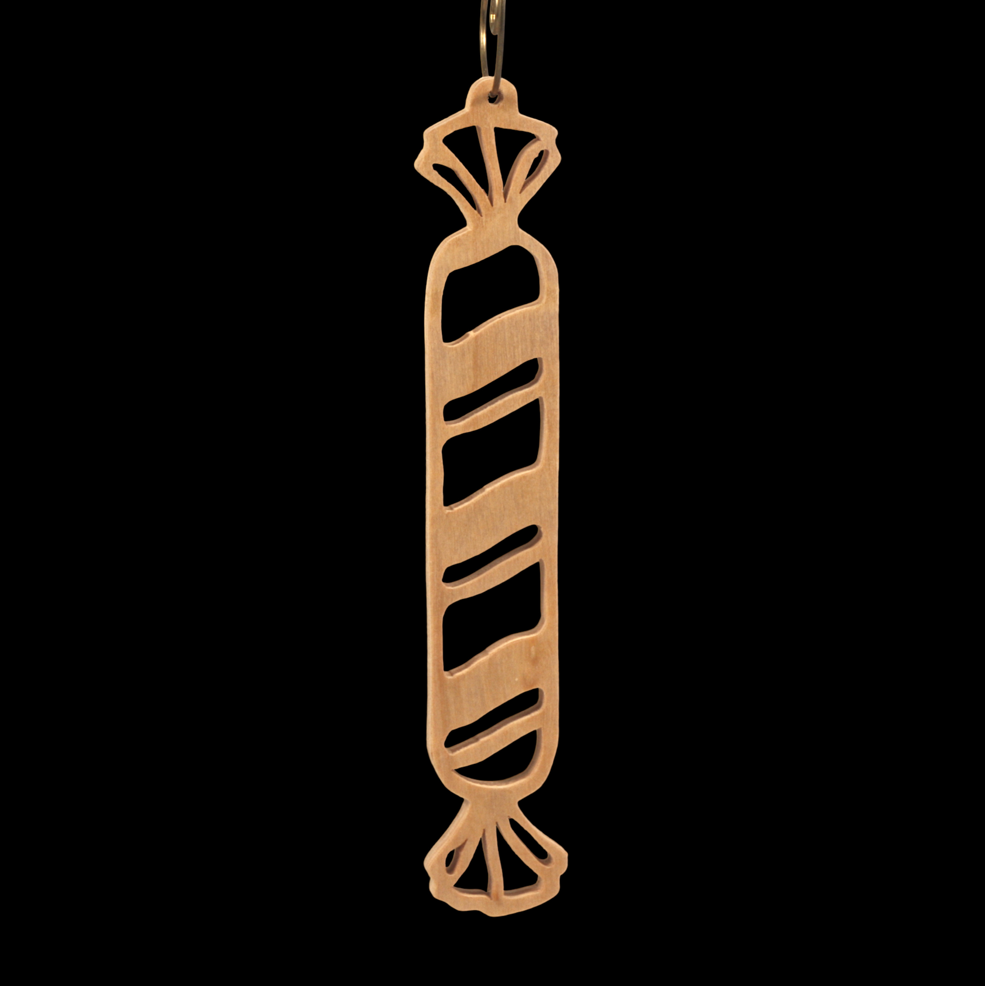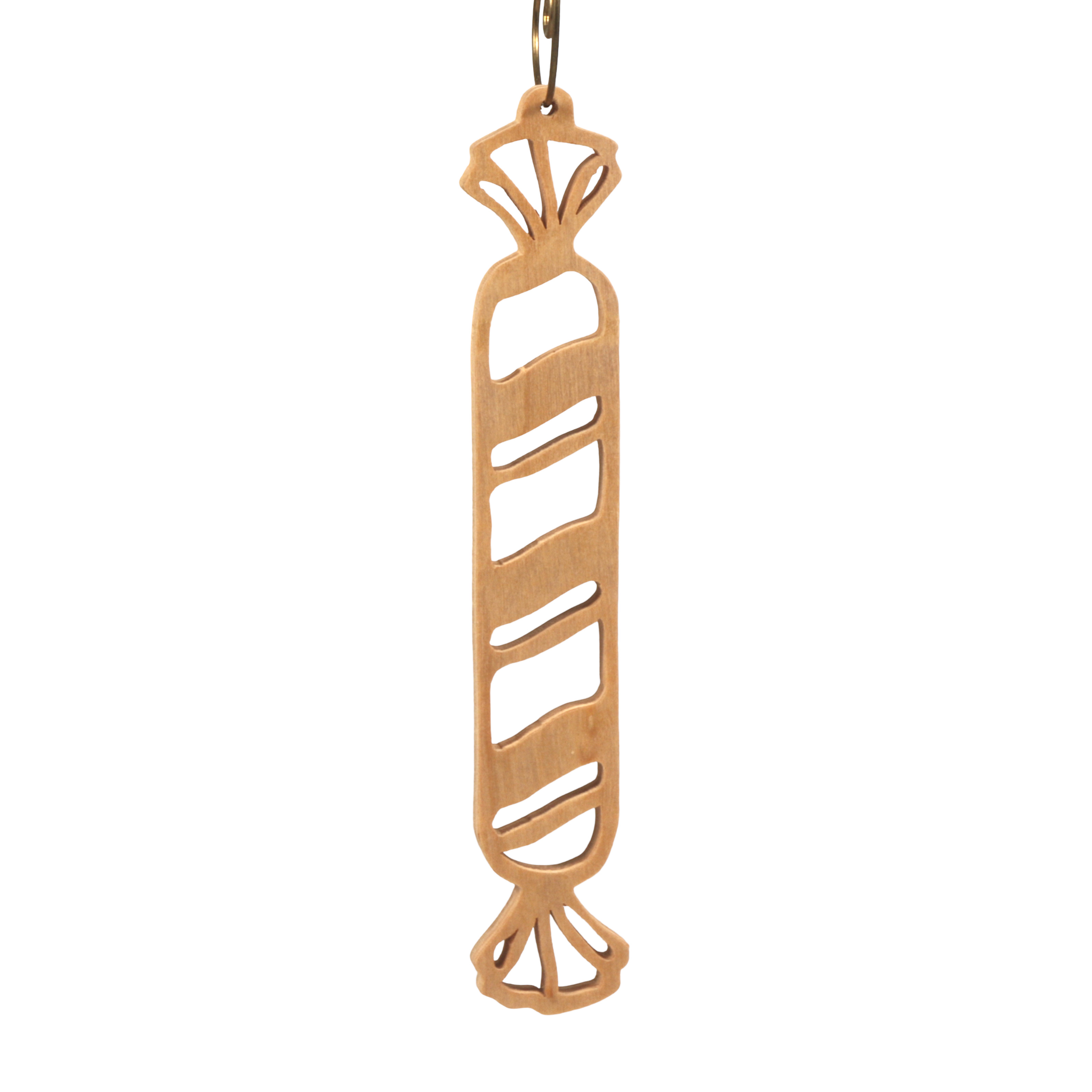 Each ornament is meticulously crafted using a scroll-saw cut design, featuring diagonal stripes that mimic the iconic look of peppermint candy. Made from light-colored wood, the ornament highlights its natural grain and texture, adding a rustic and warm feel to your holiday decor.