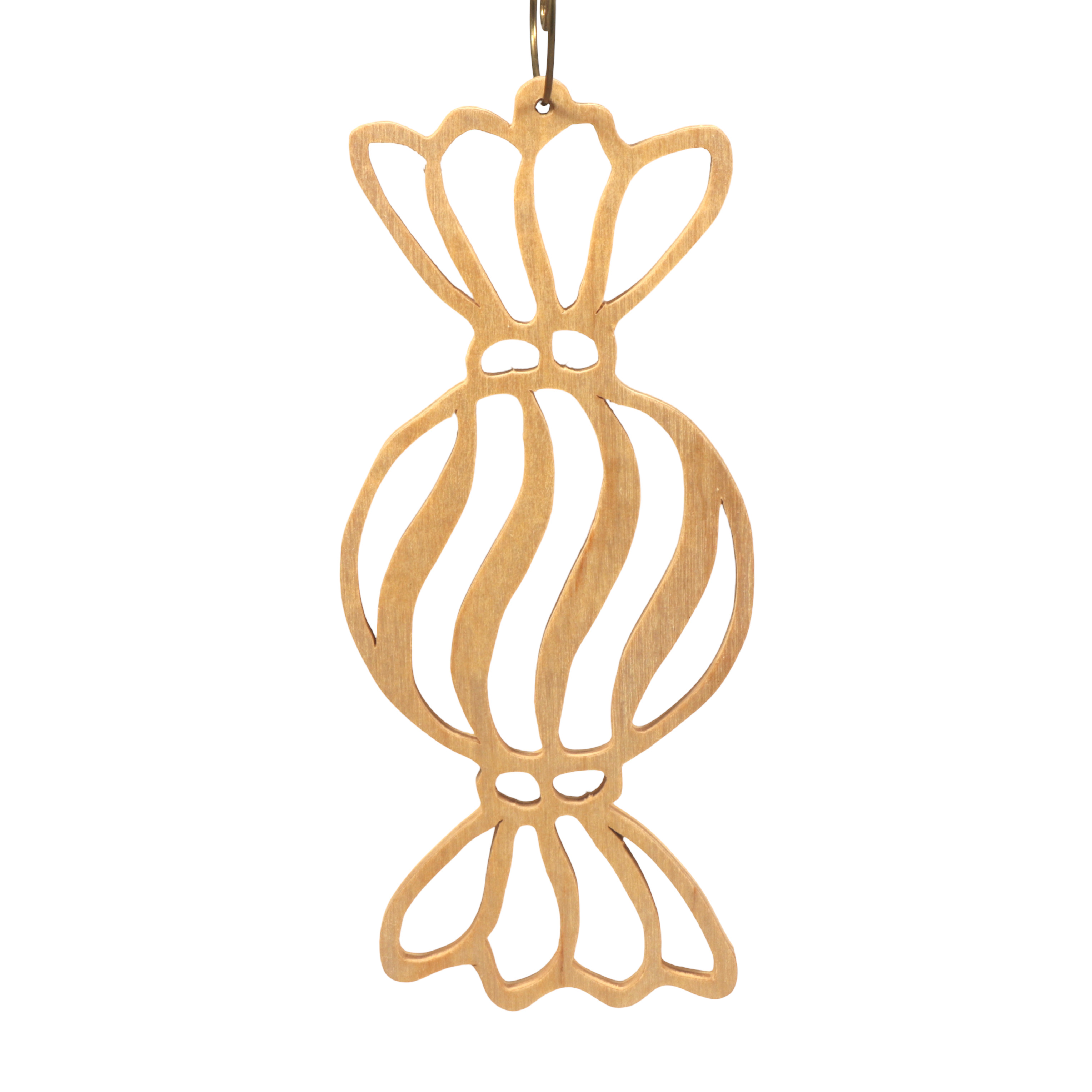 Add a touch of whimsical sweetness to your holiday decor with this handmade wooden Christmas tree ornament, crafted in my woodworking shop using a scroll saw and hand finished with clear shellac. Shaped like a classic wrapped hard candy, it features a bulbous center adorned with swirling stripes reminiscent of peppermint twists, along with an intricately designed wrapper extending to both the top and bottom. Made from light-toned wood, this rustic ornament highlights the natural grain and precise cuts, giving it a unique charm. It’s perfect for decorating your tree or as a thoughtful gift for loved ones. Each ornament is handcrafted, ensuring that every piece has its own distinctive variations.