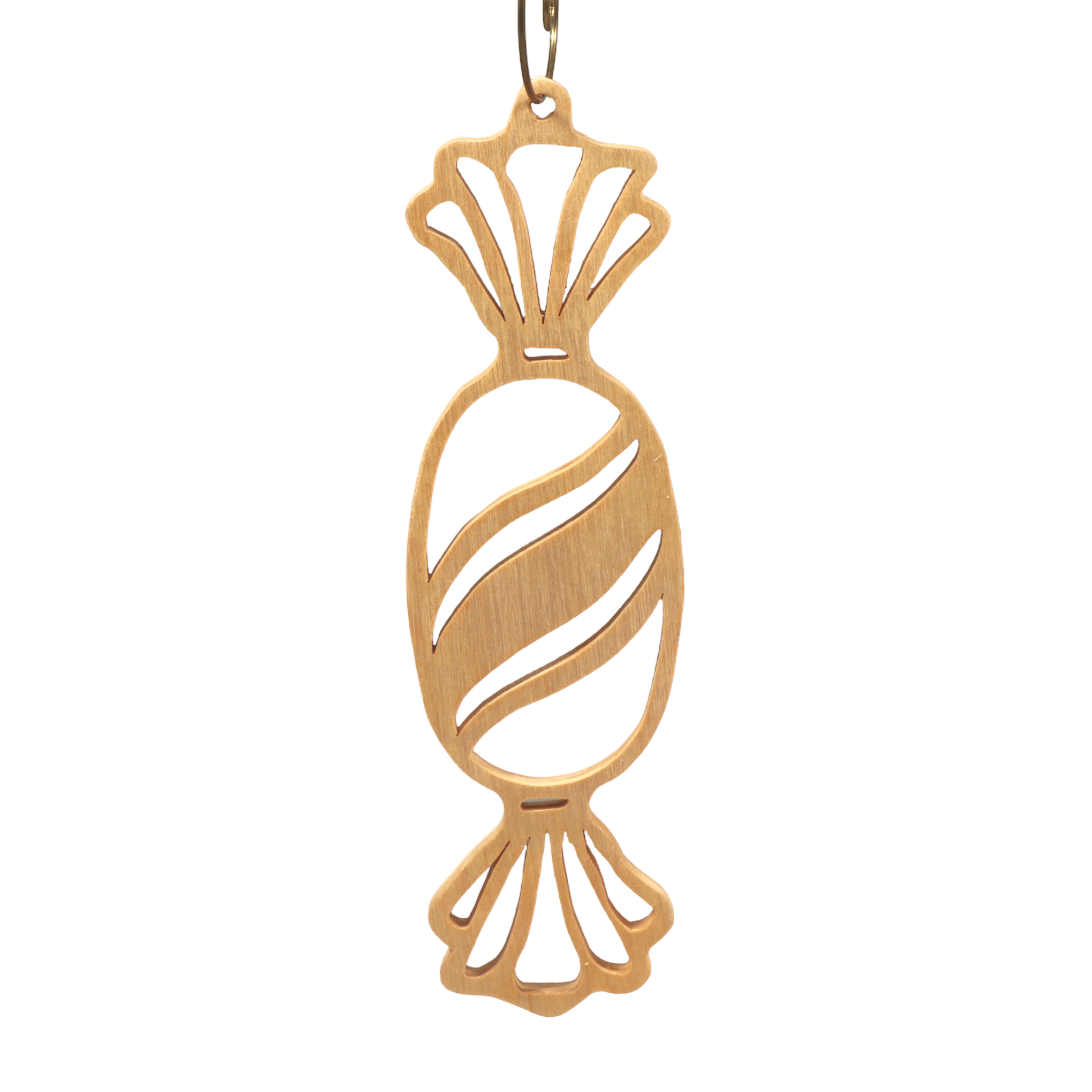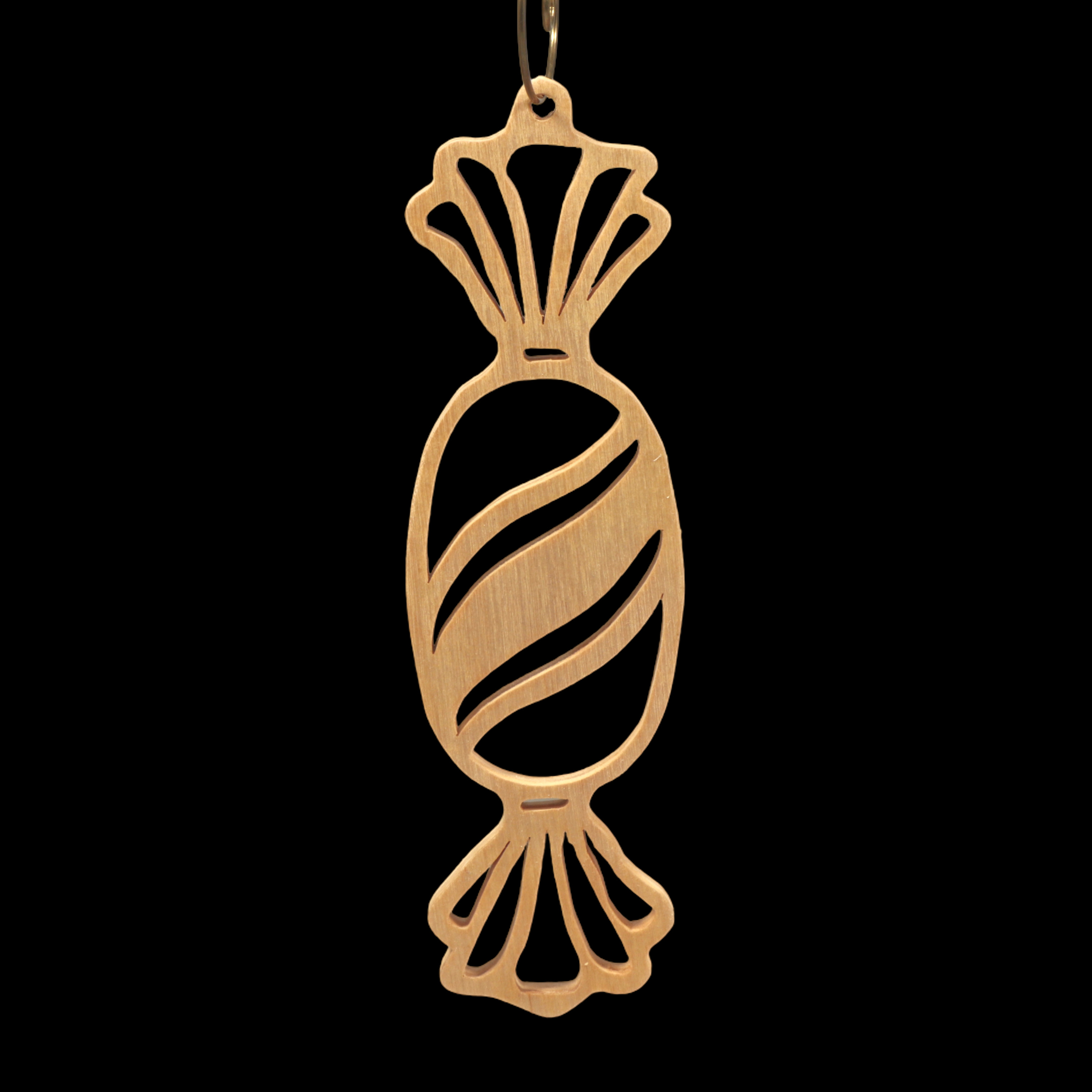 Add a touch of vintage charm to your holiday decor with this handcrafted wooden Christmas tree ornament. Inspired by the intricate Victorian fretwork style, it's meticulously hand-cut using a scroll saw from high-quality maple plywood to resemble a classic wrapped hard candy, complete with twisted wrapper ends and a swirling stripe design.