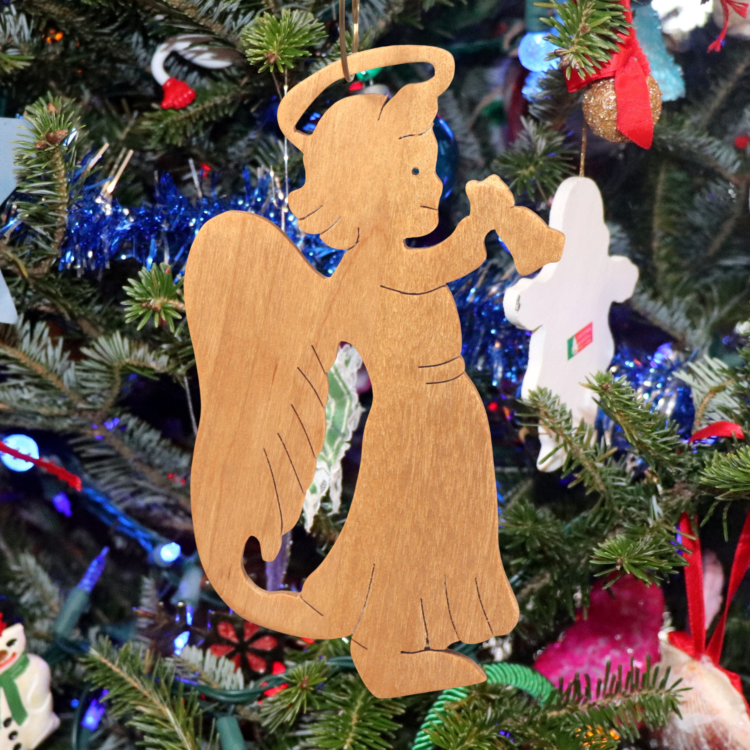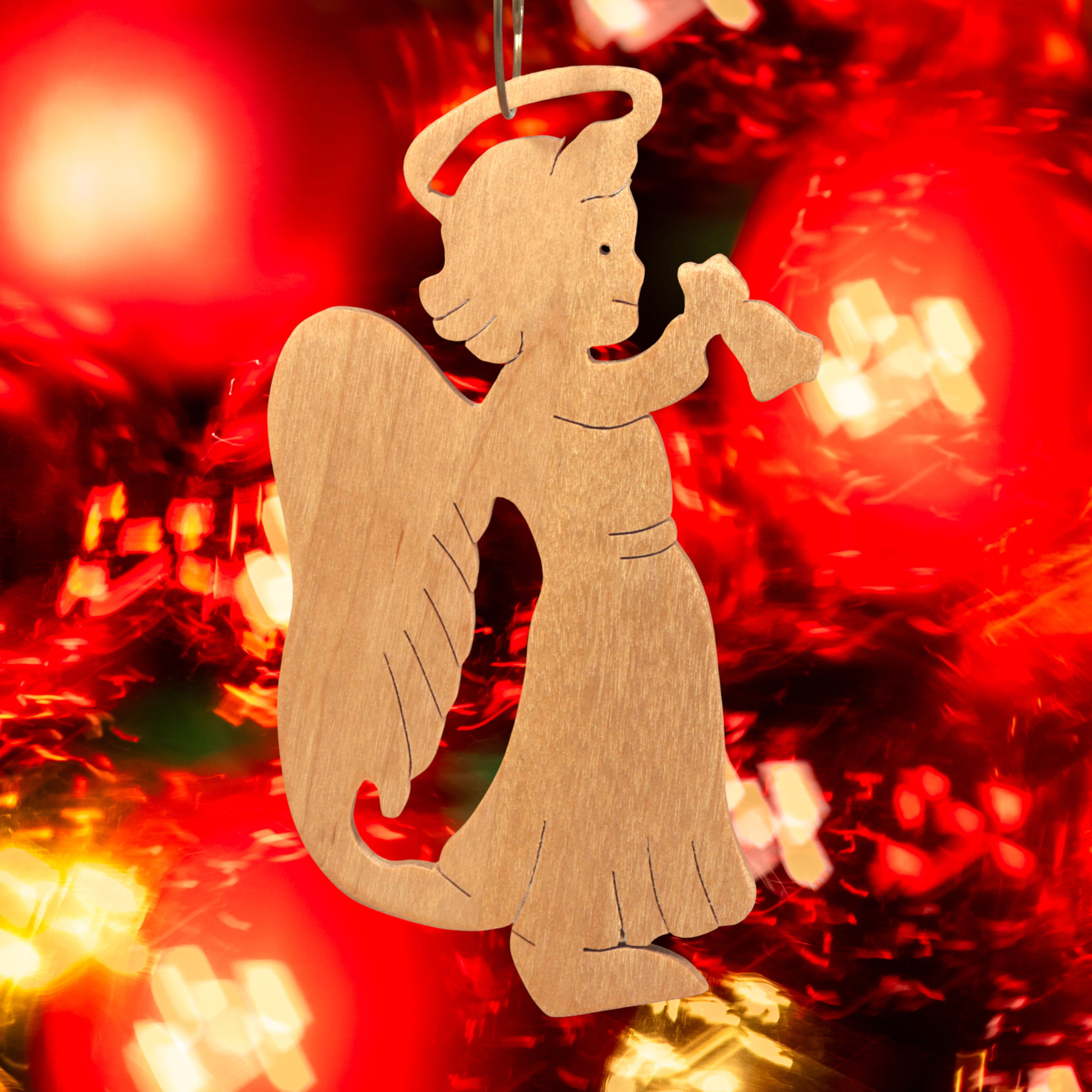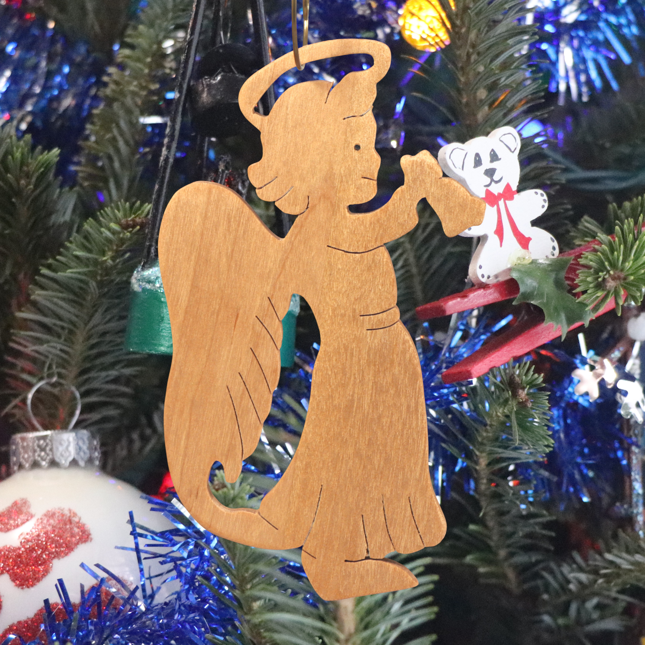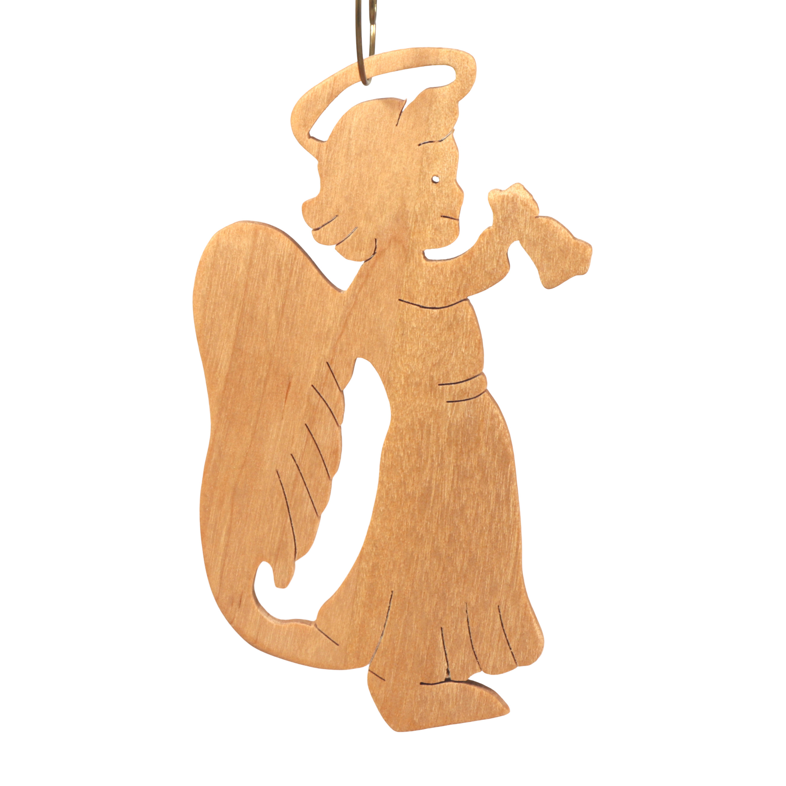 Add this wooden angel ornament to your holiday decor. Hand-cut from solid hardwood using my scroll saw, it features a cheerful angel with a halo, wings, and a raised arm ringing a bell. I finished it with clear shellac. It is perfect for traditional or farmhouse-style Christmas trees and is ideal as a thoughtful gift for loved ones, a stocking stuffer, or a special addition to your own ornament collection.