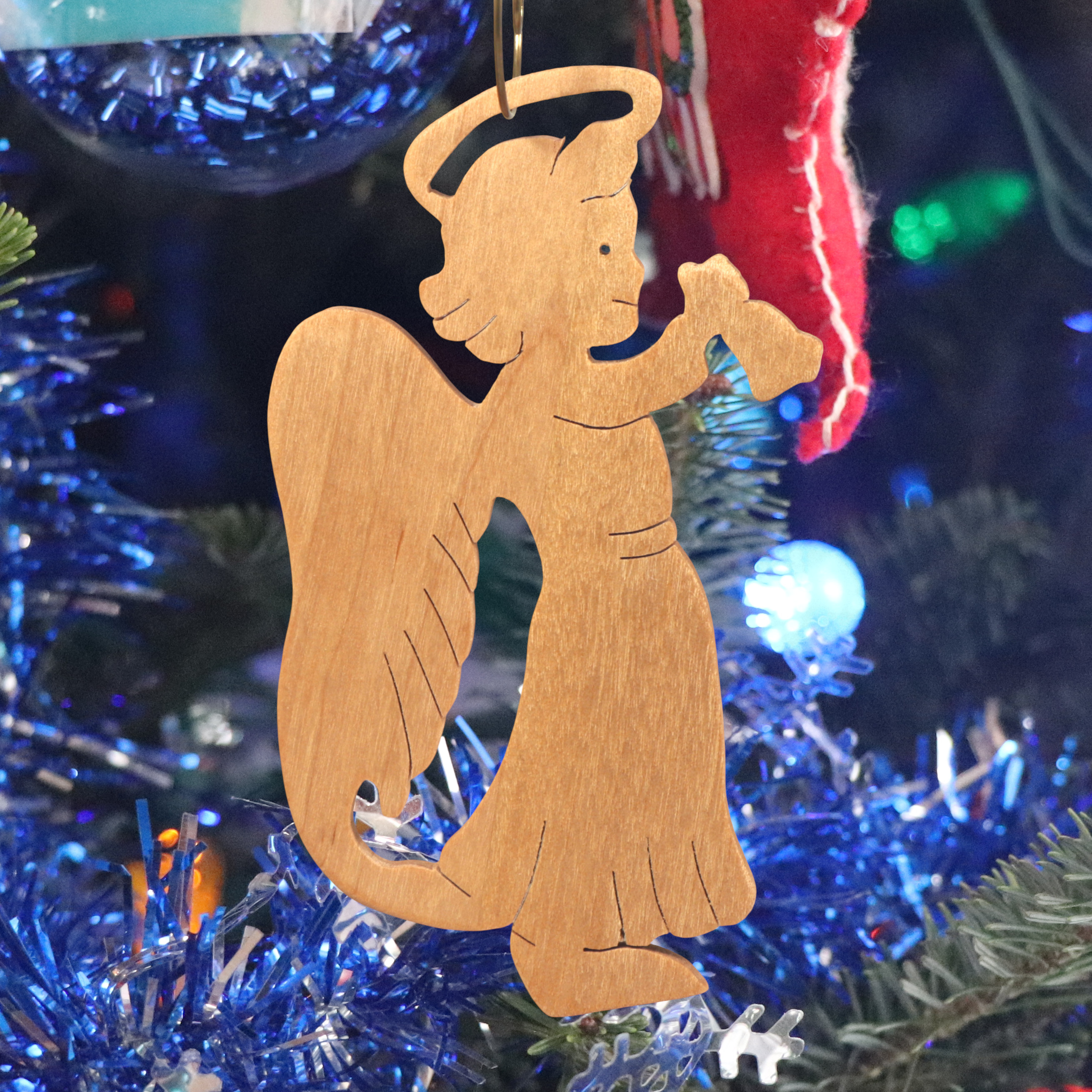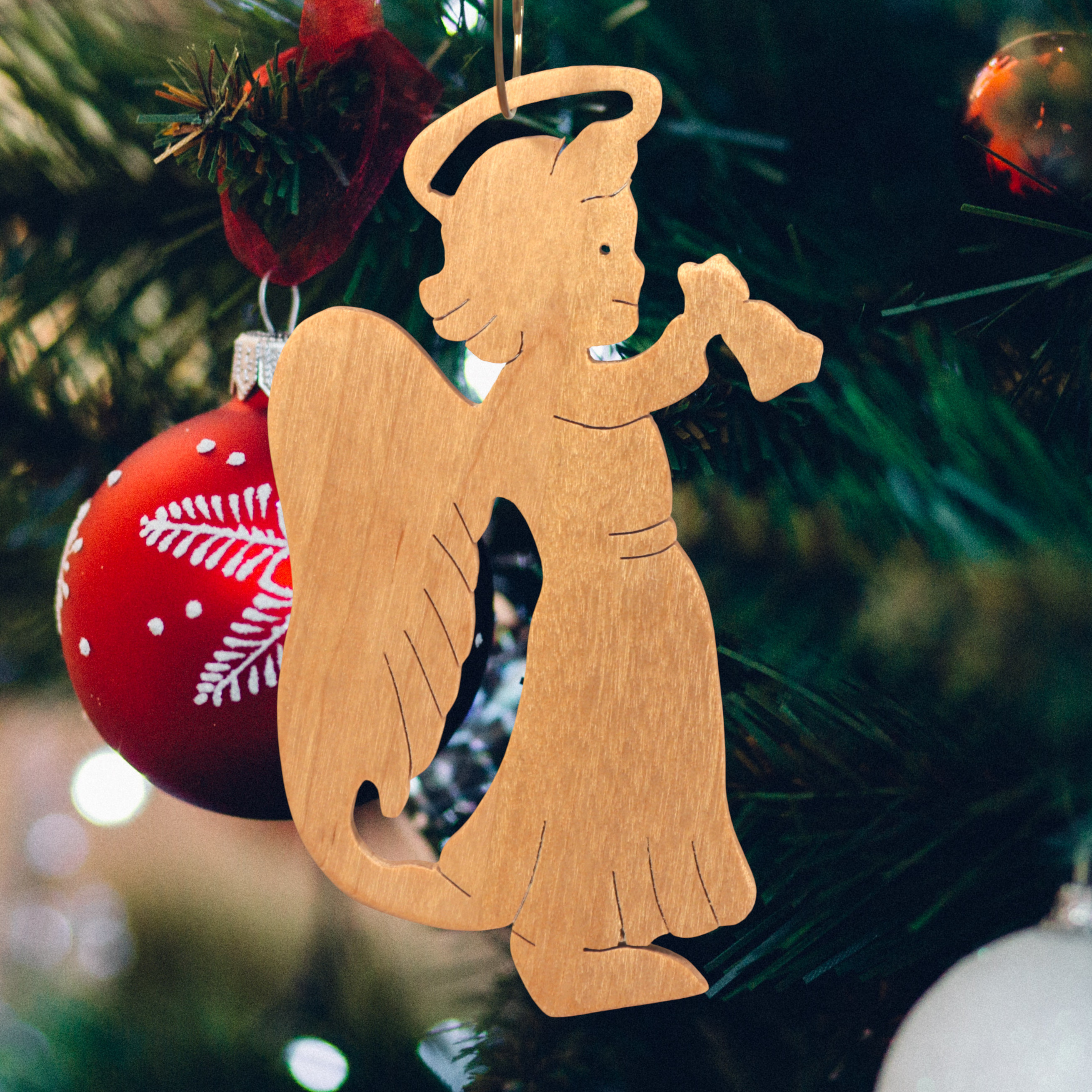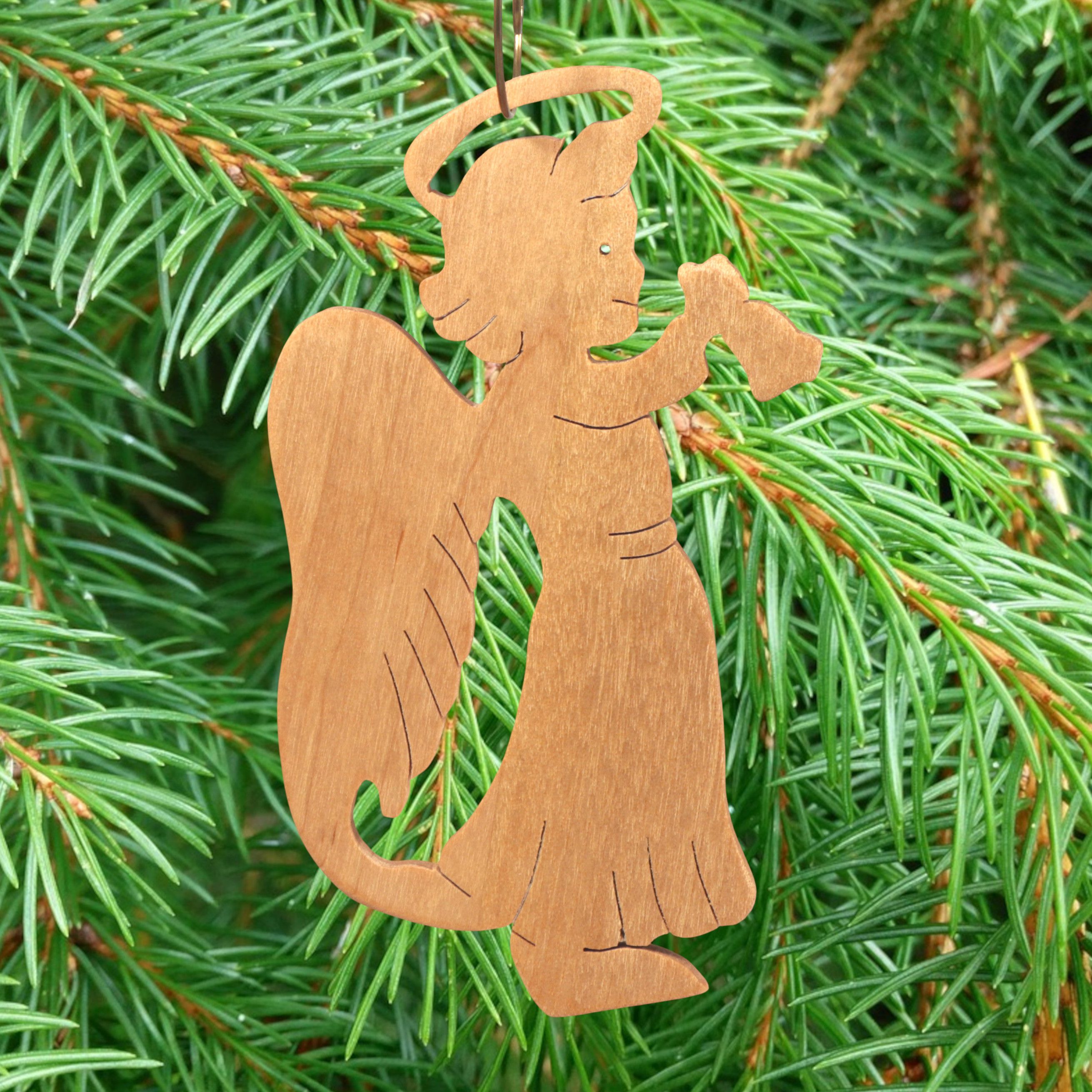 Add this wooden angel ornament to your holiday decor. Hand-cut from solid hardwood using my scroll saw, it features a cheerful angel with a halo, wings, and a raised arm ringing a bell. I finished it with clear shellac. It is perfect for traditional or farmhouse-style Christmas trees and is ideal as a thoughtful gift for loved ones, a stocking stuffer, or a special addition to your own ornament collection.