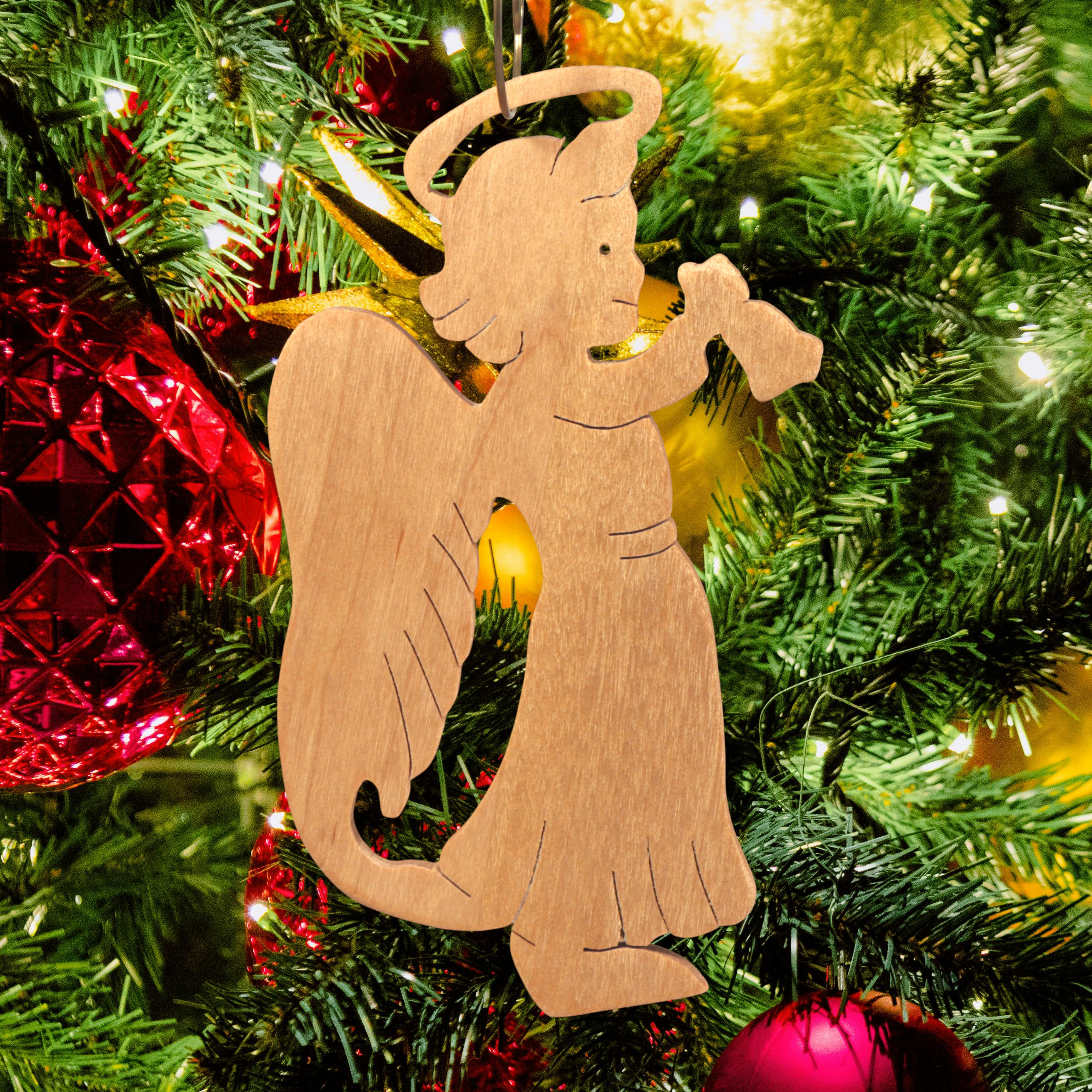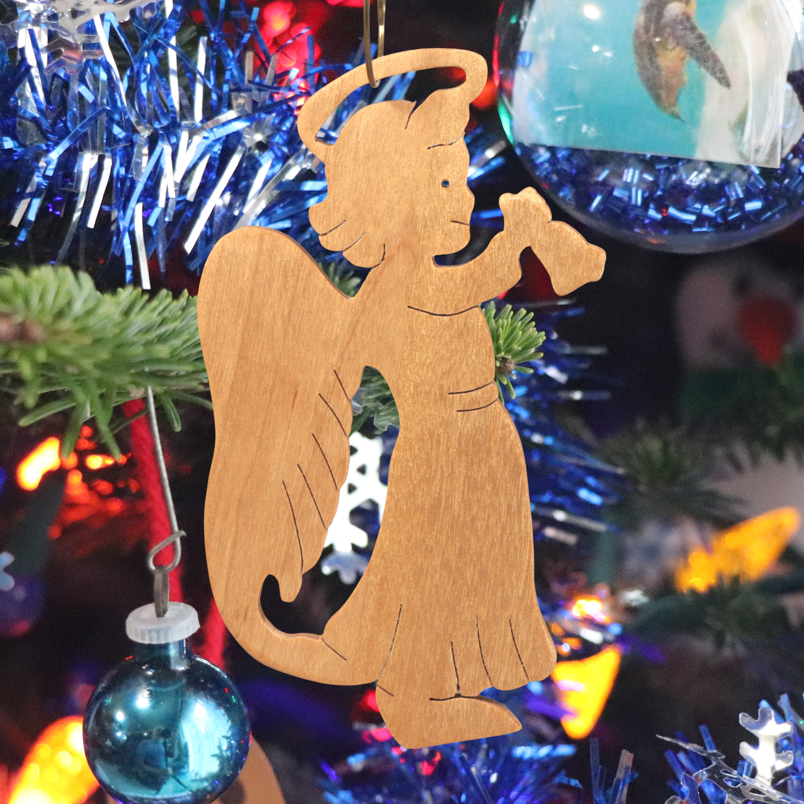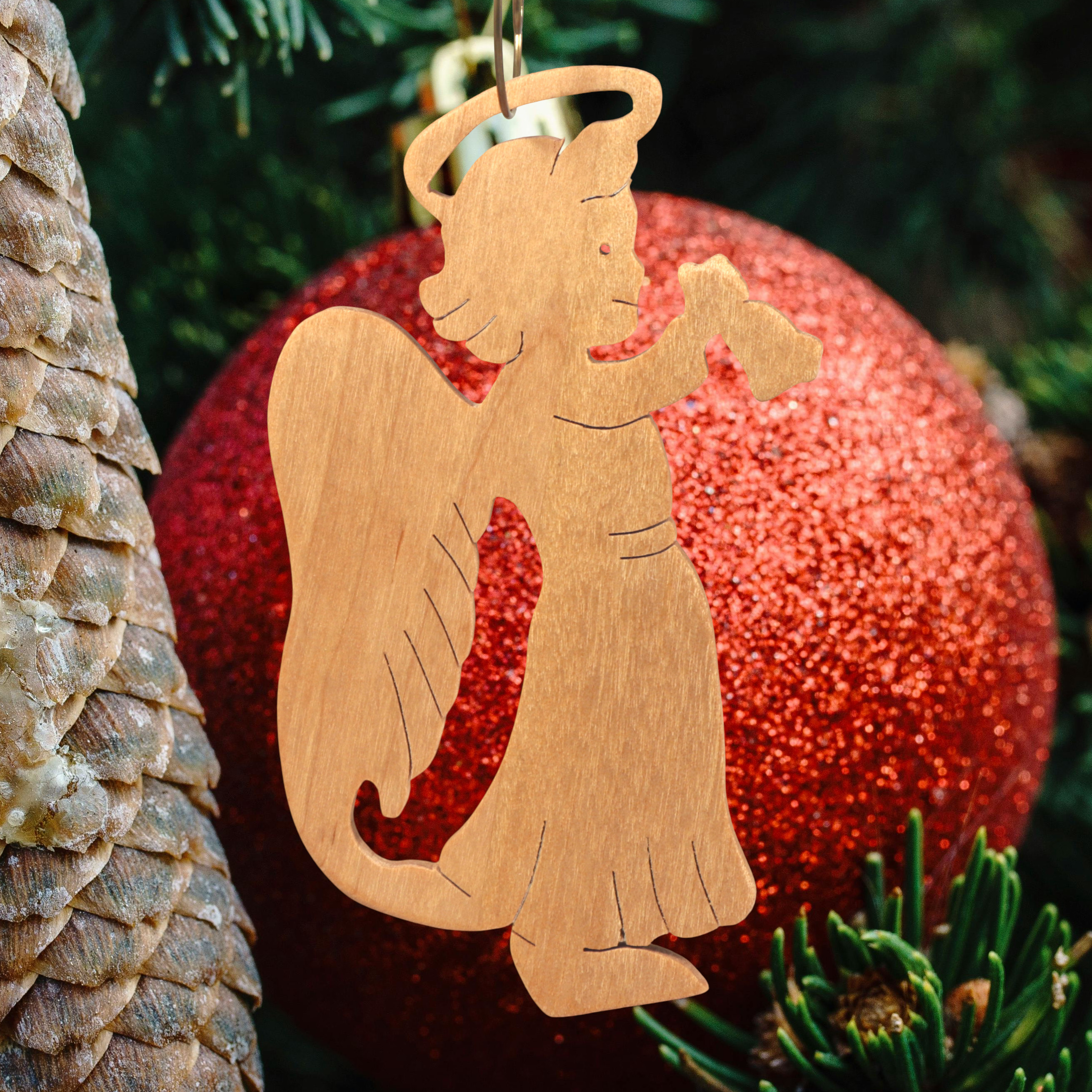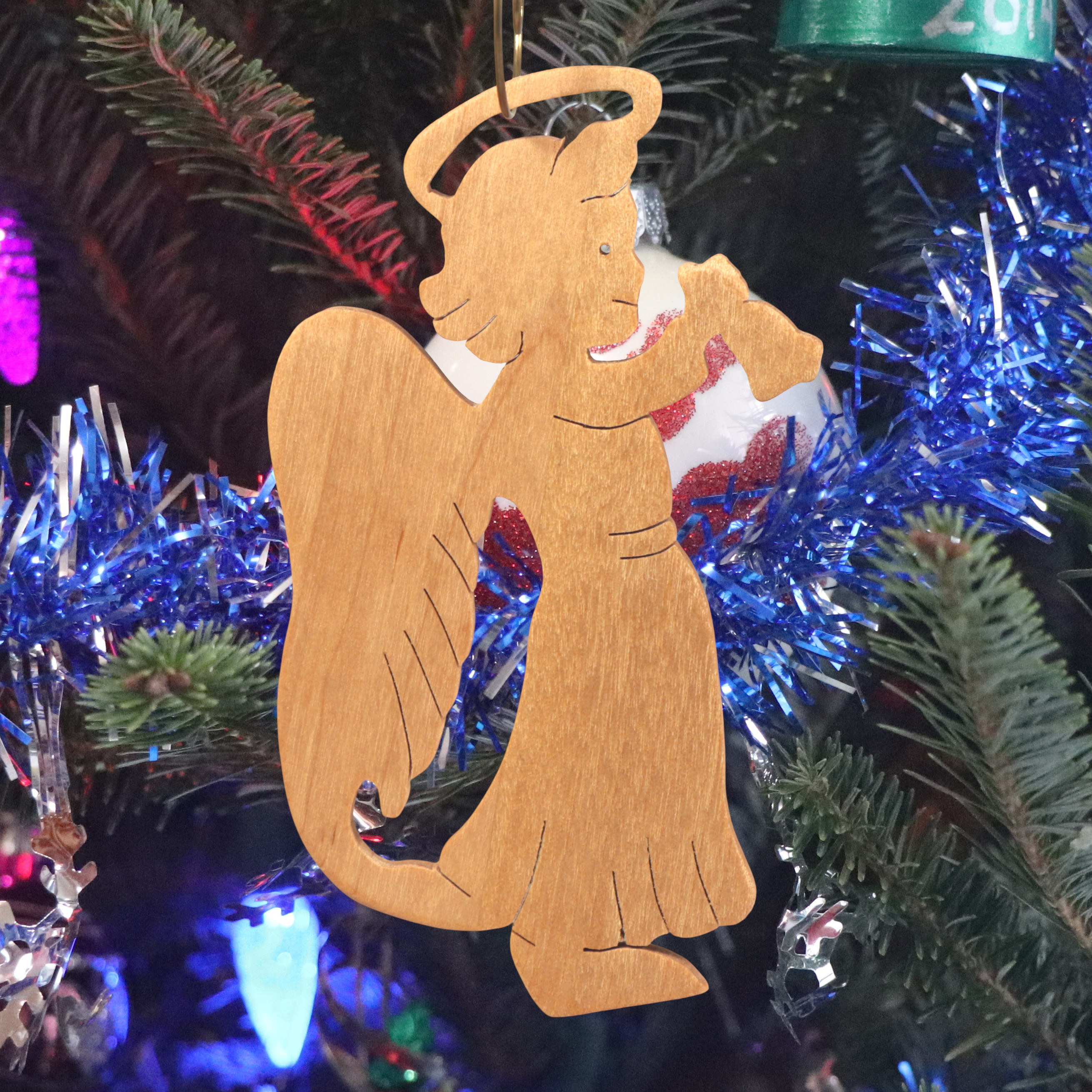 Add this wooden angel ornament to your holiday decor. Hand-cut from solid hardwood using my scroll saw, it features a cheerful angel with a halo, wings, and a raised arm ringing a bell. I finished it with clear shellac. It is perfect for traditional or farmhouse-style Christmas trees and is ideal as a thoughtful gift for loved ones, a stocking stuffer, or a special addition to your own ornament collection.