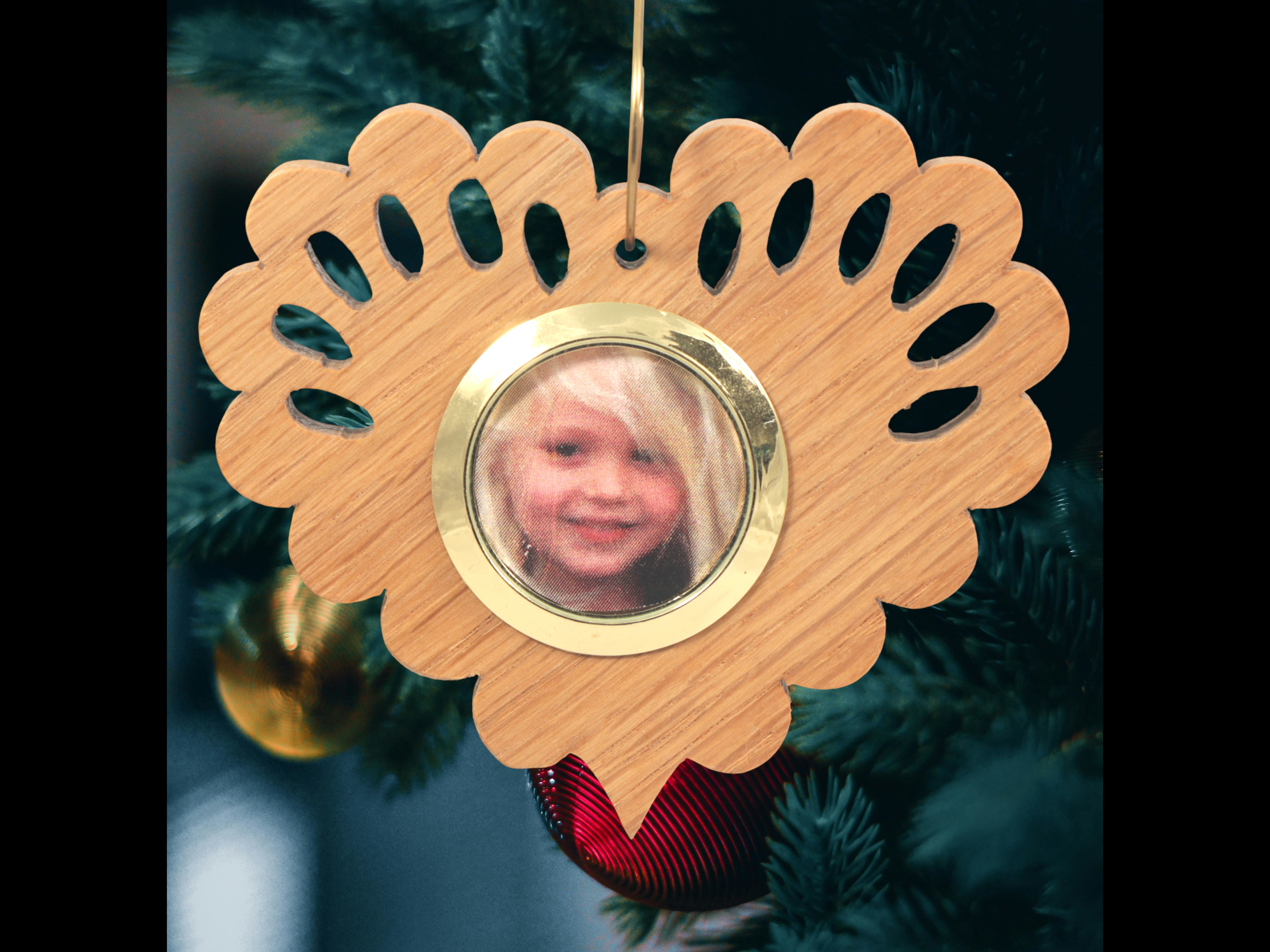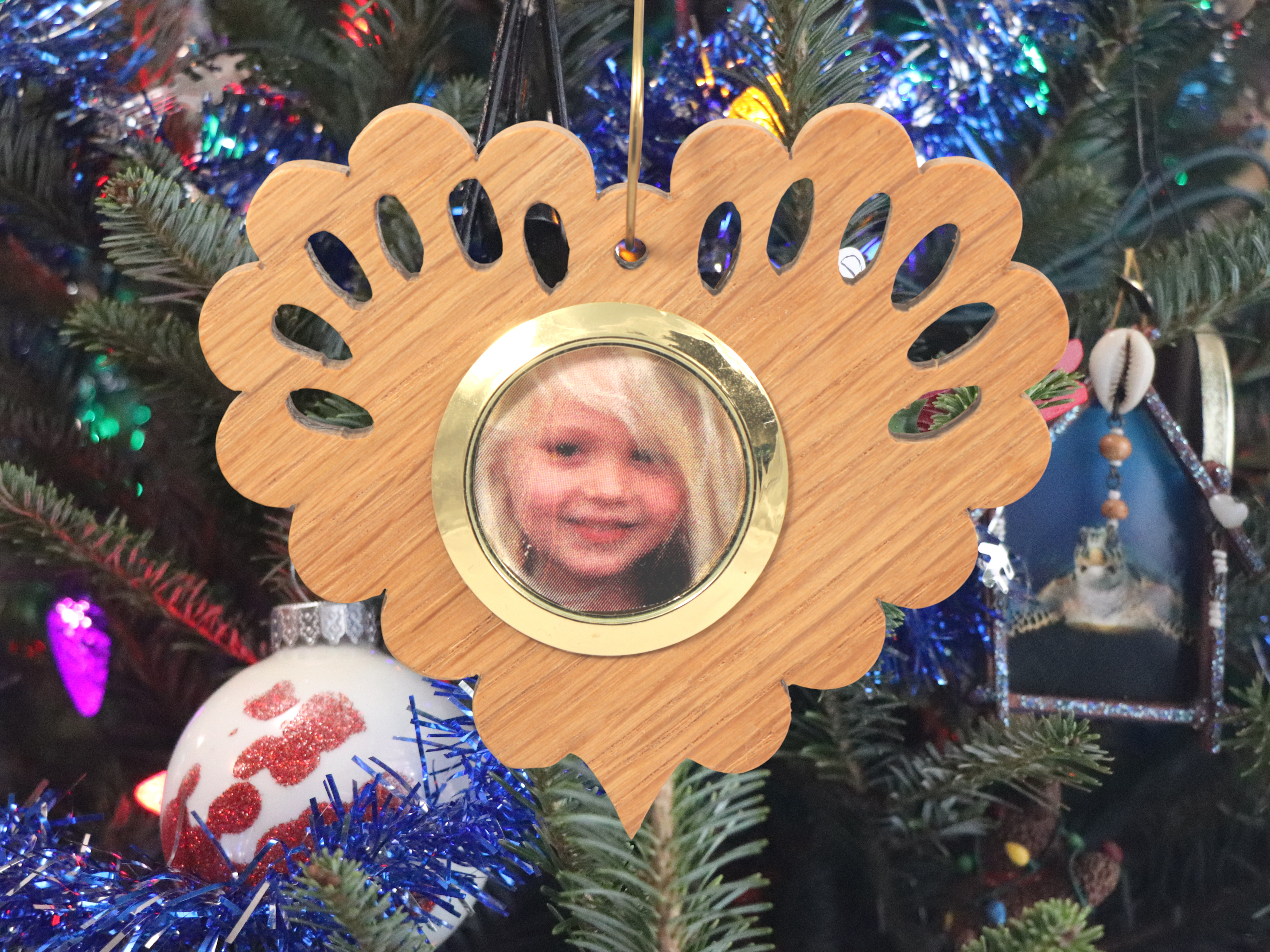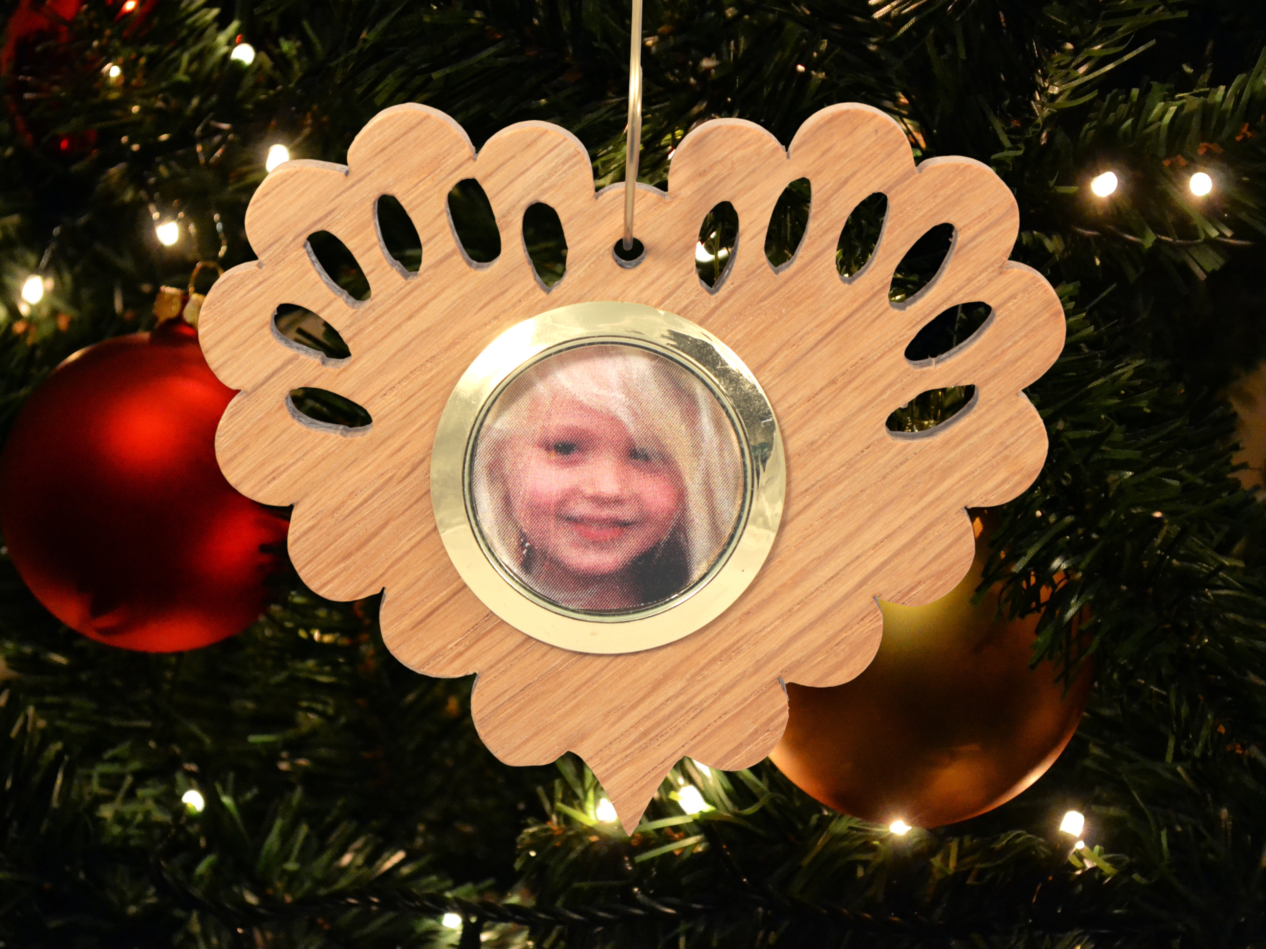 I created this heart-shaped photo ornament from reclaimed oak using my scroll saw. It features scalloped edges and a clear shellac finish that highlights the wood's natural grain. The center has a removable gold-toned round frame where you can insert your own photo.