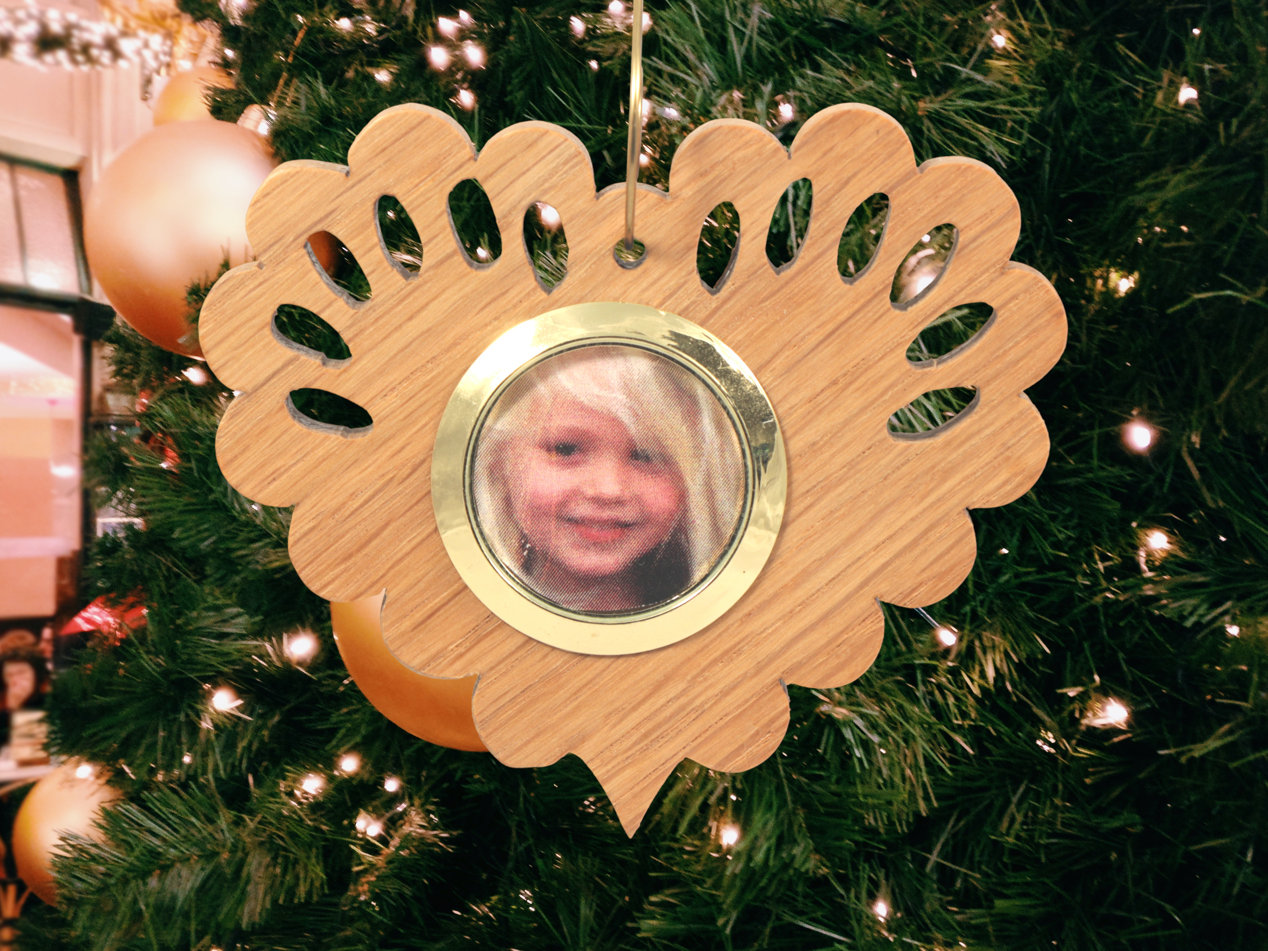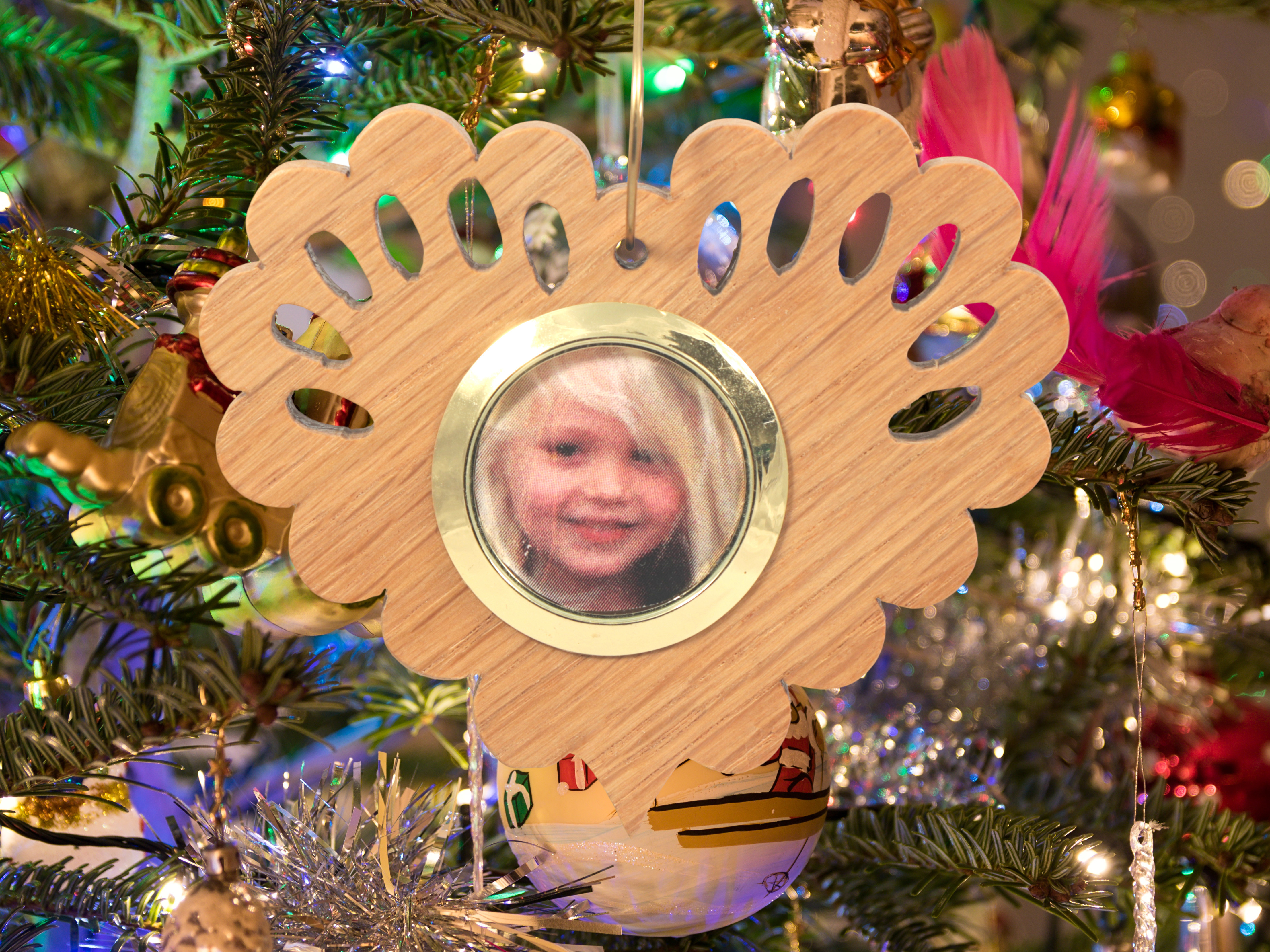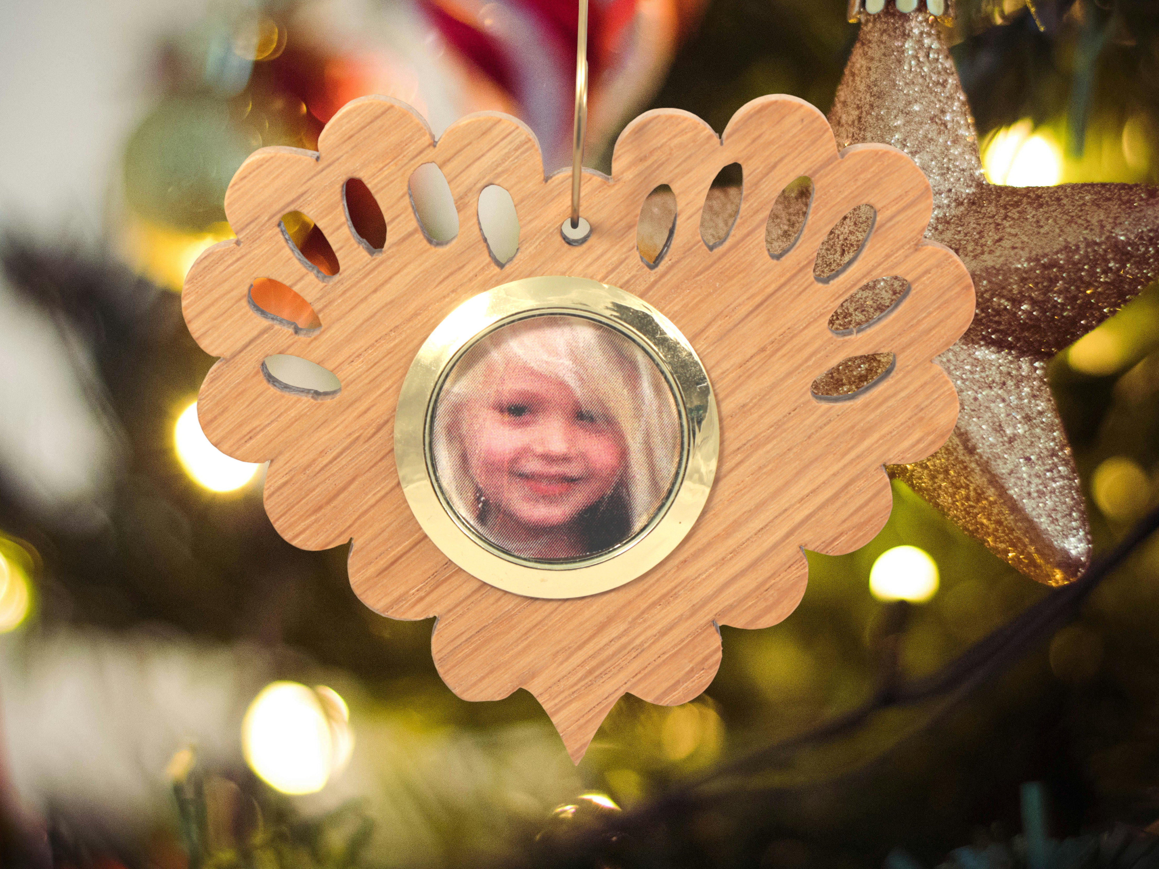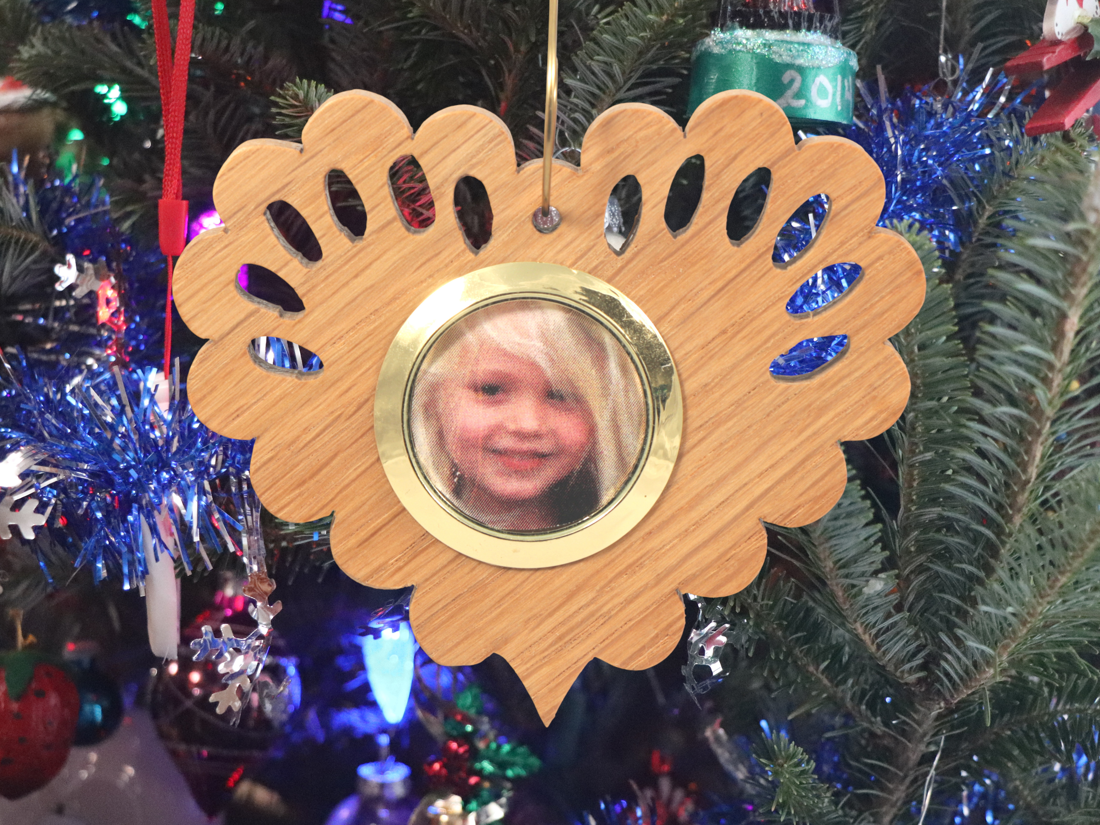 I created this heart-shaped photo ornament from reclaimed oak using my scroll saw. It features scalloped edges and a clear shellac finish that highlights the wood's natural grain. The center has a removable gold-toned round frame where you can insert your own photo.